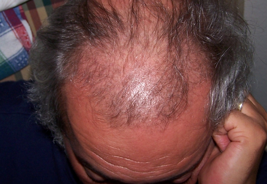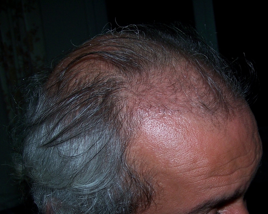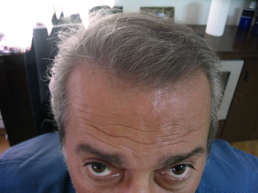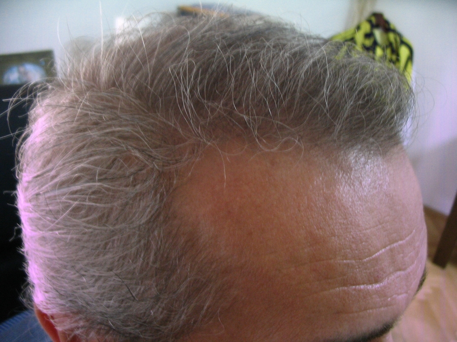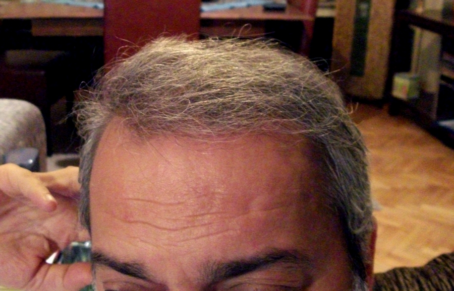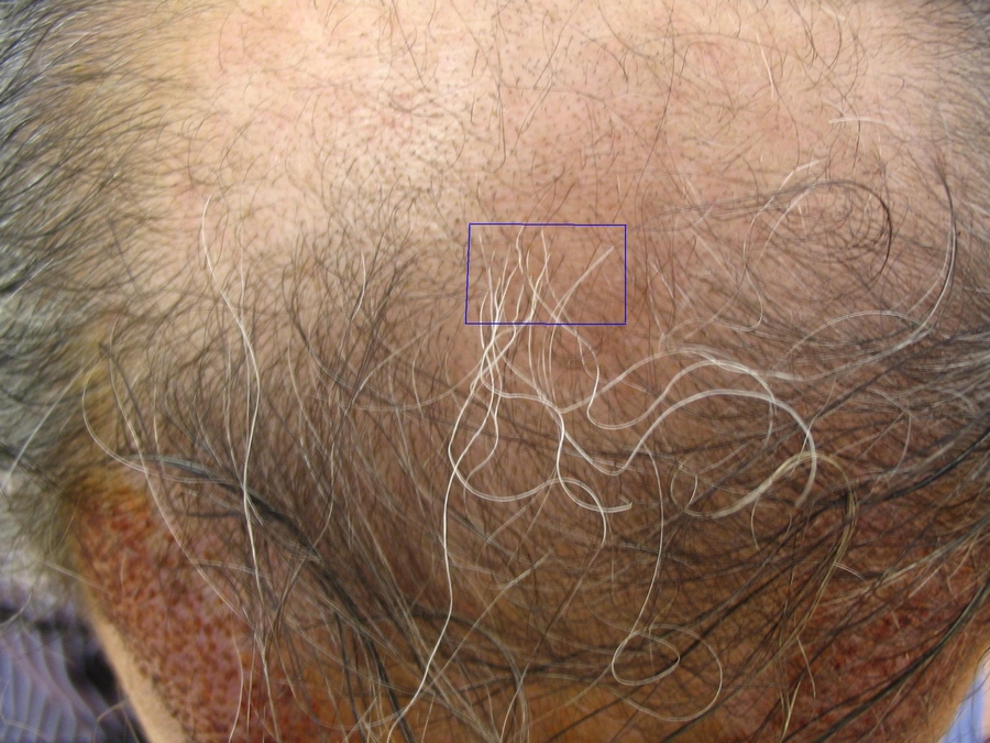 Patient ist über 50 Jahre alt, weisse Haare. Weisse Haare machen eine FUE sehr schwierig.