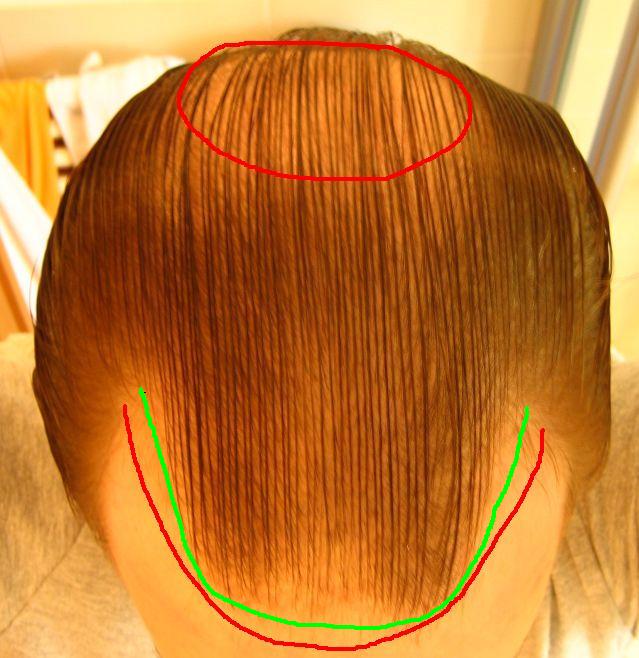 Sagen wir es so, die Tonsur stört mich mehr. Ich würde auch alles machen lassen, aber das wird bei meinen dünnen Haaren und der geringen Dichte im Spenderbereich in einer OP wohl nicht machbar sein. Daher erst die Tonsur und vielleicht die lichte Stelle in der Stirnmitte, dann - wenn Propecia weiterhin verlässlich seinen Dienst verrichtet - die Geheimratsecken in ungefähr dem Bereich, den Du auf dem Photo markiert hast. Da ich die Haare nich nach hinten kämme, fallen die Ecken nicht so sehr auf. Die Tonsur kann ich dank Dermmatch und Toppik zwar auch noch gut kaschieren, aber da hab ich keine Lust mehr drauf.