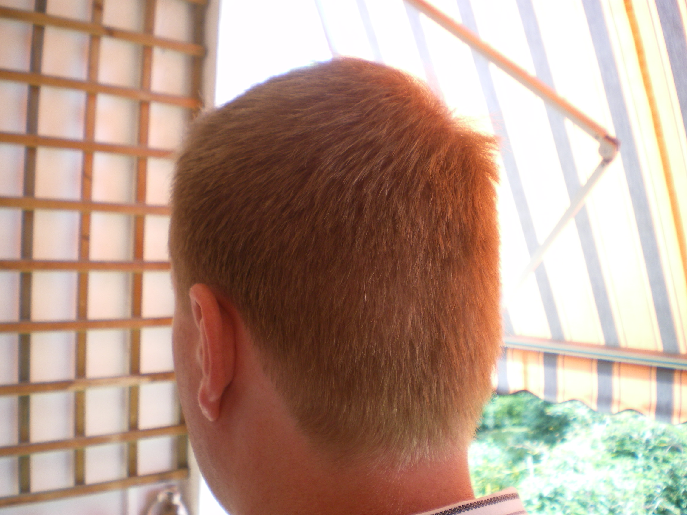 Hallo Leute. Hier also nun mein letztes Update mit den versprochenen Donorbildern. Hoffe sie sind einigermaßen aussagekräftig. Die Fotos sind vom 4.Juli und ich war eine Woche vorher beim Friseur. Wer genau hinschaut kann sehen wo die Entnahmefläche ist. Aber ich denke es sieht ganz gut aus mit dieser Haarlänge.