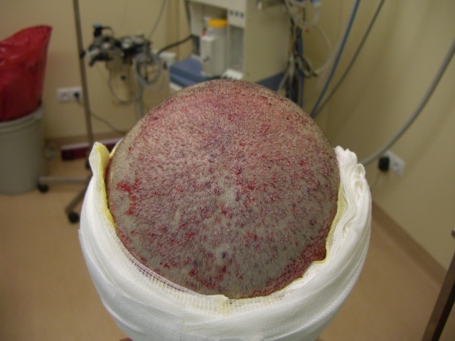 Der Kopf brennt noch leicht, so wie ein Sonnenbrand, an der Verpflanzten Stelle fuehlt es sich noch Taub an und ich habe auch eine Schwellung seitlich am Kopf (Hat sich im Laufe des Tages gebessert).