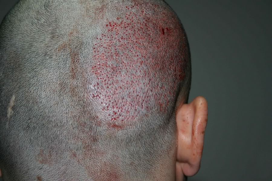 Wenn die Wunden anfangen zu heilen juckt es. Nach 5 Tagen waren die letzten Blutkrusten abgefallen. Ein paar Tage danach war die Kopfhaut an den operierten Stellen noch rötlich. Je länger die Haar wurden umso weniger war dann noch davon zu sehen. Wenn man nach ein paar Monaten die Haare beiseite drückt sieht man, dass die Kopfhaut an der operierten Stelle noch etwas gerötet ist. Das fällt im Normalfall aber nicht auf und vergeht wieder.