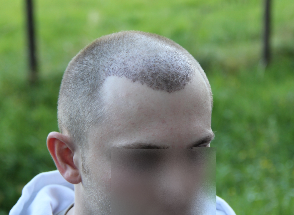 Am ersten Tag wurde die Haarlinie mit 1500 Grafts rekonstruiert. Am zweiten Tag das Gebiet dahinter mit 1600 Grafts bearbeitet. Es wurde auf eine Fläche von ca. 67 cm² transplantiert.
