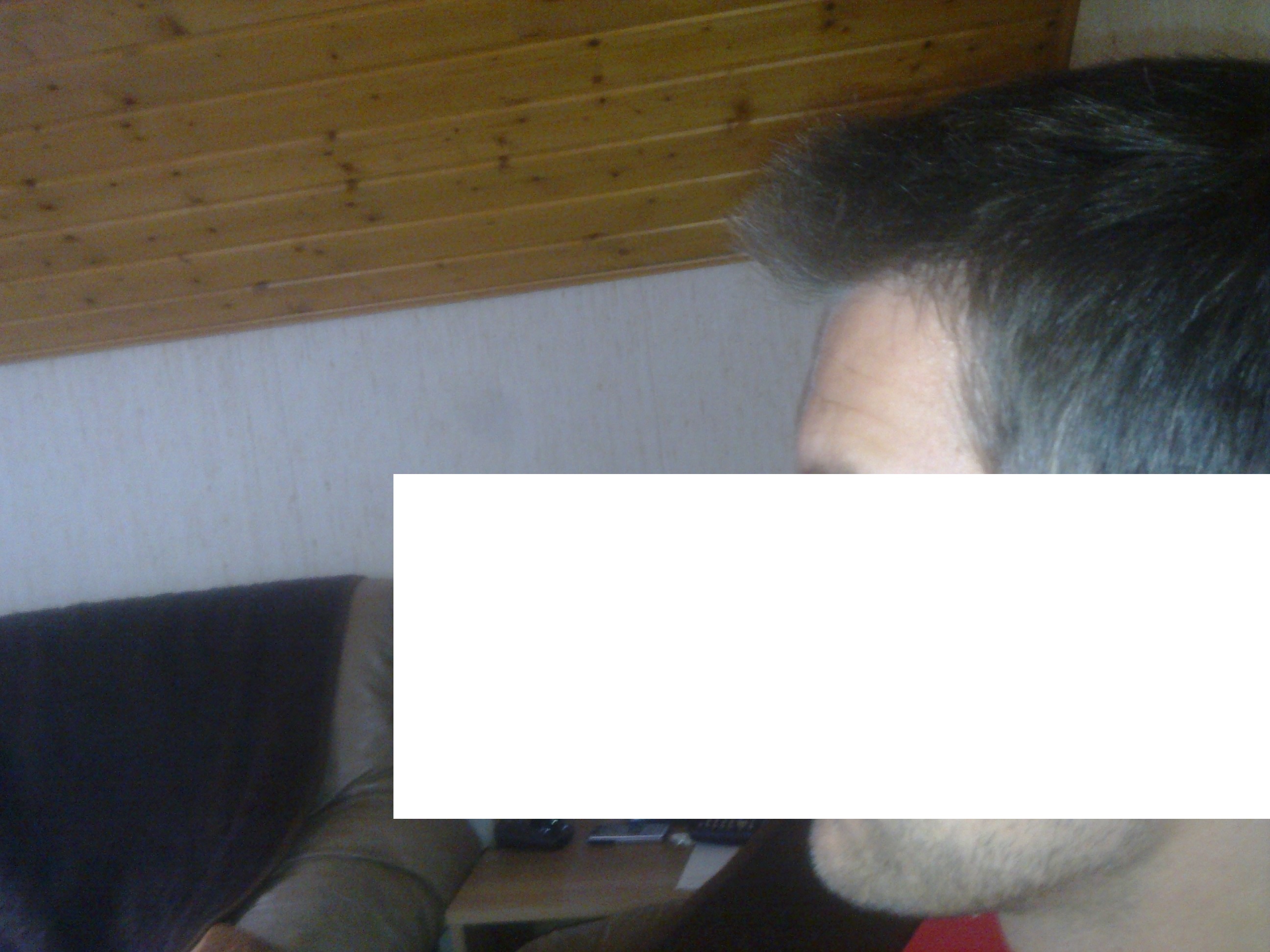 Das zweite Bild ist das Bild des Grauens: mein Oberkopf unter einer Lampe und mit Blitzlicht. Hier sieht man ganz gut die Schneise, die sich über den Scheitel frisst. Zum Glück sieht es bei normalem Lichteinfall nur halb so schlimm aus.