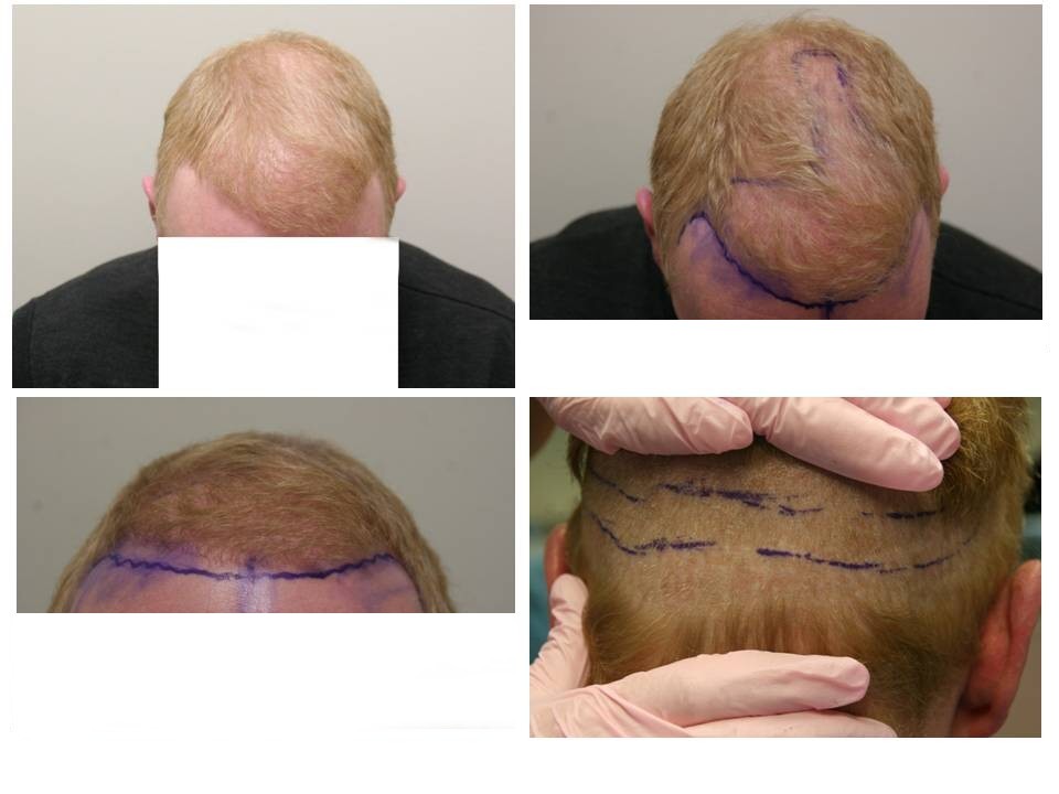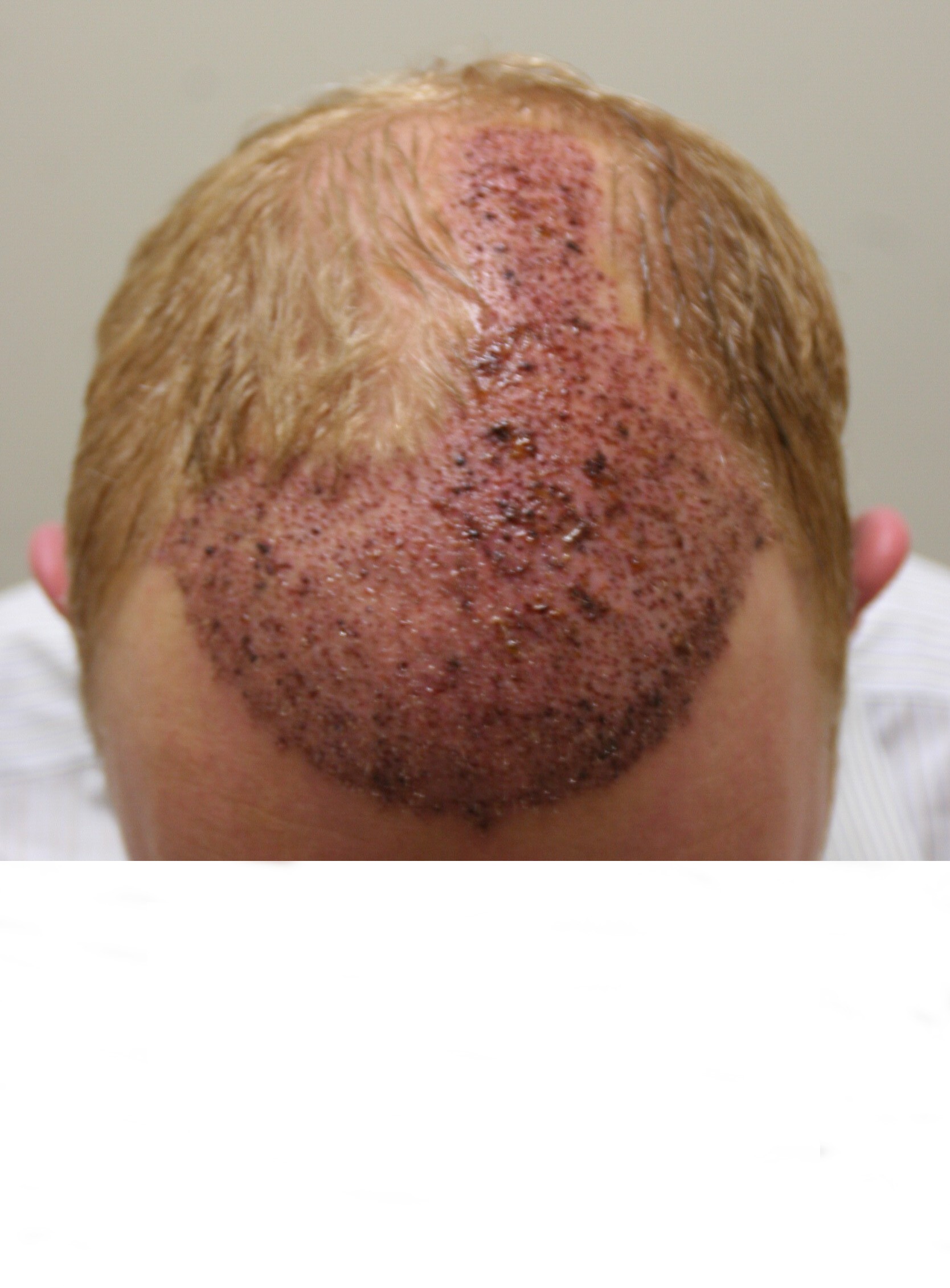 Das deutsche Ergebnis war nicht zufriedenstellend: viel zu geringe Haardichte und sichtbarer Haaransatz, vgl. Bilder. Darüber hinaus wurden bei den ersten beiden Operationen kreisrunde Transplantate von ca. 4mm Durchmesser entnommen und die Löcher nicht zugenäht, obwohl dies von anderen Anbietern zu der Zeit schon gemacht wurde. Bei den nachfolgenden Operationen wurde jeweils ein Strip entnommen, so dass z. T. kreisrunde Löcher von zuvor „zusammenliefen". Das ergab auch am Hinterkopf eine nicht zufriedenstellende Situation.
