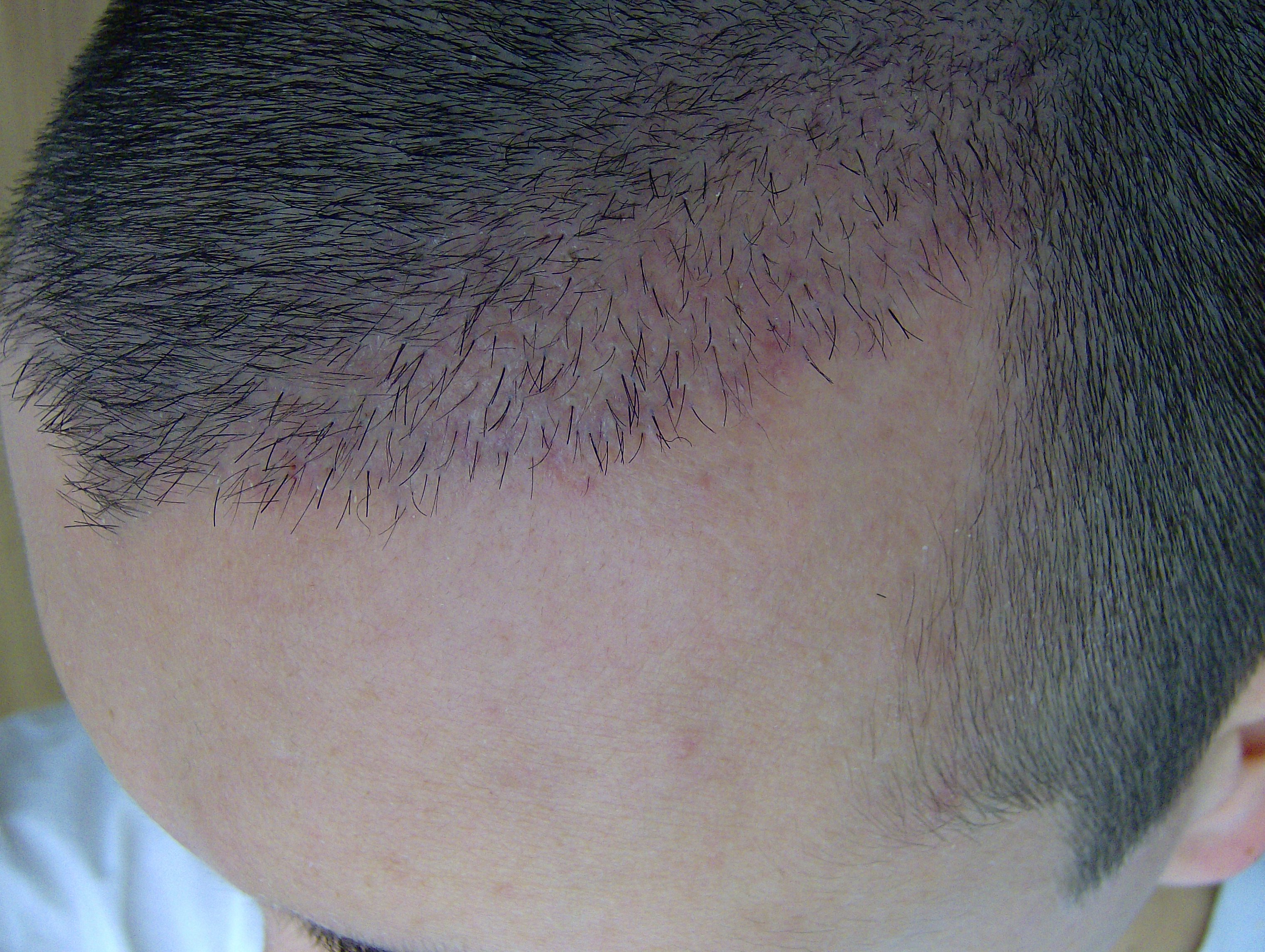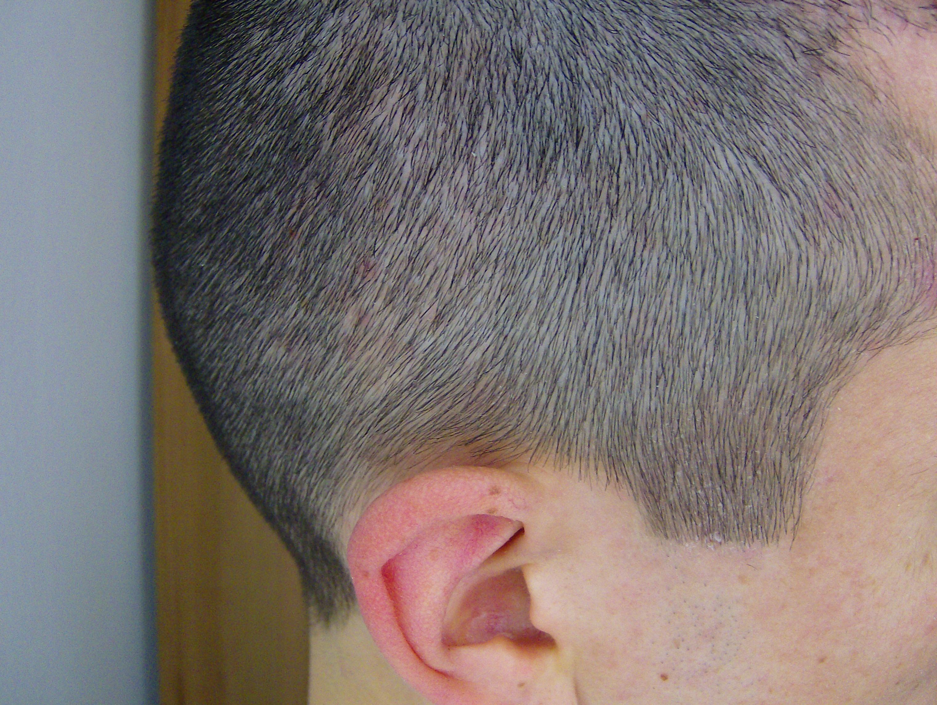 Kurz zur Erklärung: Ich habe erst einmal ein Paar Fotos gemacht, die allerdings nicht sehr gut geworden sind, da es schon dunkel war und künstliches Licht, besonders der Blitz der Kamera die Situation verfälscht. Da hatte ich eine Haarlänge von etwa 7mm bis 1cm. Am nächsten Morgen habe ich mir die Haare auf 3mm rasiert und danach bei Tageslicht ohne Blitz nochmal sehr viele Fotos gemacht, die ich euch auch alle hier reinstelle.