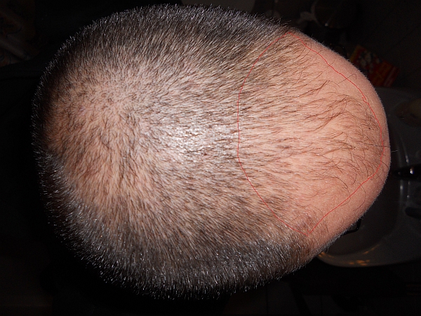 Die farbig umzogene Fläche ist 70 bis 80 qcm groß. Wie man sieht habe ich recht dicke, kräftige Haare. Hoffe 3000 bis 4000 Grafts reichen aus.