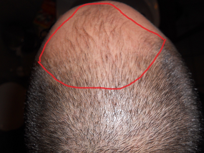 so hier mal Bilder. Wobei ich sagen muss: der Blitz ist echt gemein. Schaue ja aus wie NW5 bis NW6. So schlimm ist es im natürlich Licht auf keinen Fall. Ich habe mal die Fläche die bepflanzt werden soll fasrbig eingekreist bei den ersten Bildern. Hinten soll es erstmal so bleiben. Medikamentös nutze ich nur Minoxidil Foam. Der wirkt auch ganz gut.