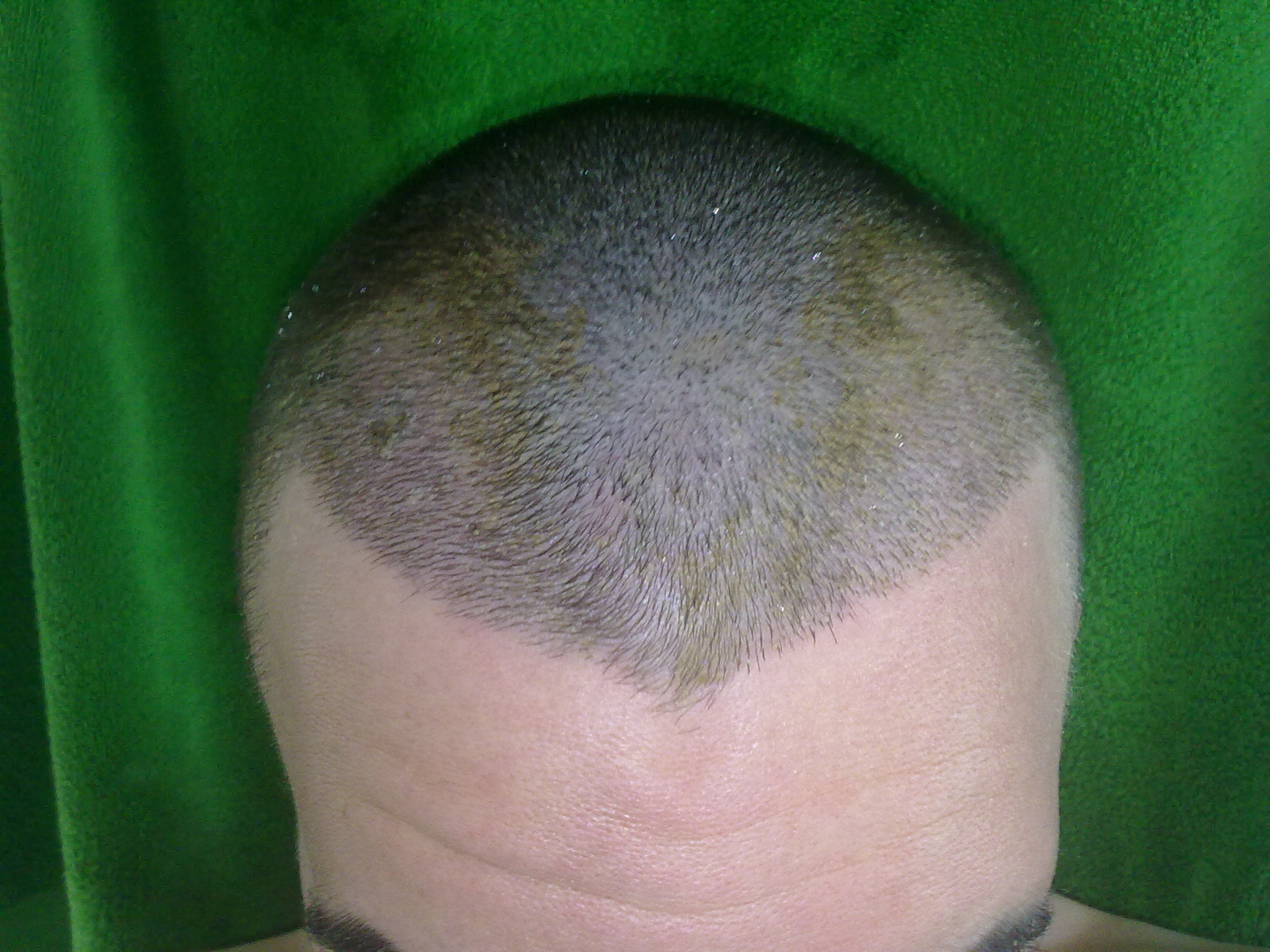 Also was ich noch anbieten kann, ist ein 4 Wochen Post OP Bild bei dem man quasi sieht wie es vor der OP aussah, da zu diesem Zeitpunkt die Haare kurz waren und alle Transplantate ausgefallen waren. Leider in Handyqualität, aber ich denke der Ausgangsstatus ist zu erkennen.