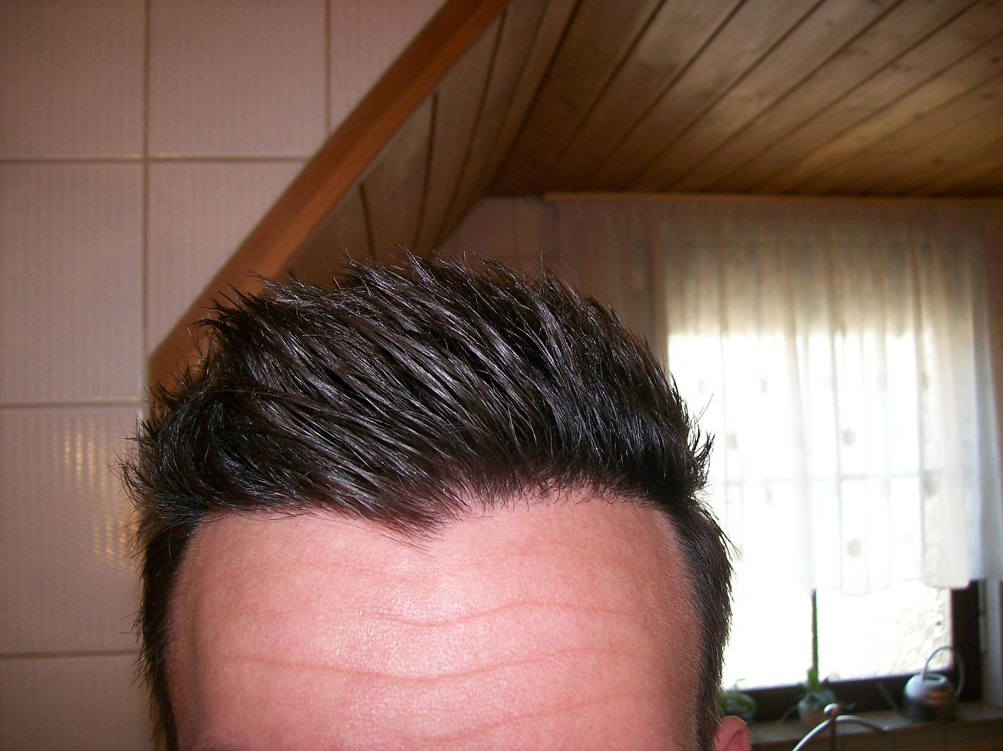 bin nun 13 wochen Post OP. Hat sich schon einiges getan. Nach 3 Wochen waren bei mir bereits 90% der Haare ausgefallen. Danach war die Zeit äußerst bescheiden. Die übrig gebliebenen 10% habe ich alle 2 Tage mit der Nagelschere oder dem Nassrasierer gekürzt, da es echt bescheiden aussah wenn ich sie habe wachsen lassen. Die ursprünglichen Haare habe ich bisher nicht angerührt und einfach wachsen lassen. So kann ich jetzt 13 Wochen Post OP die transplantierten Stellen einigermaßen kaschieren. Der Neuwuchs ist noch etwas dünn und die transplantierten Haare sind natürlich durch das ständige kürzen (inzwischen lass ich alle Haare einfach wachsen) deutlich kürzer als die ursprünglichen Haare. Die beiden Fotos die ich nun präsentiere sind eher spontan entstanden. Ich habe ein bisschen Wax in den Haaren. Die Fotos sind mit Blitz fotografiert. Bei Gelegenheit gibts dann auch mal bessere Fotos. Aber nach 3 Monaten lässt sich eh noch nicht soviel sagen.... Jetzt heißt es weiter abwarten.