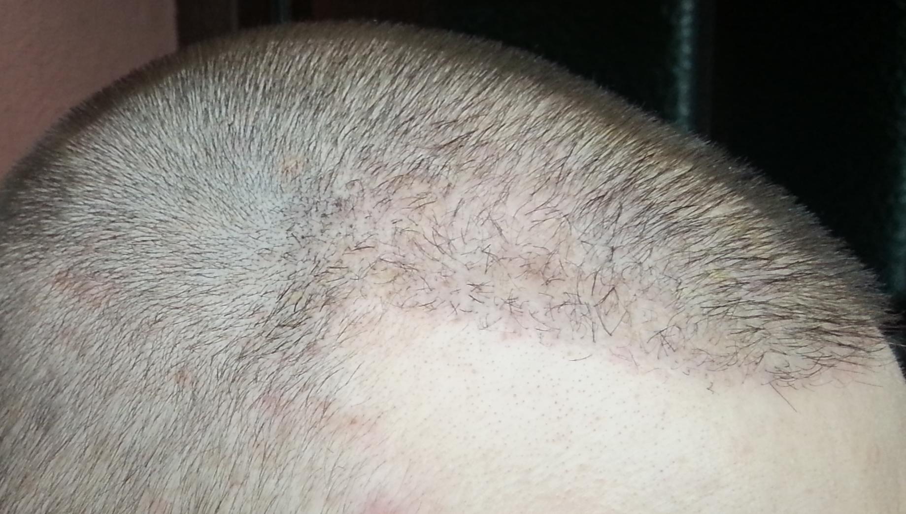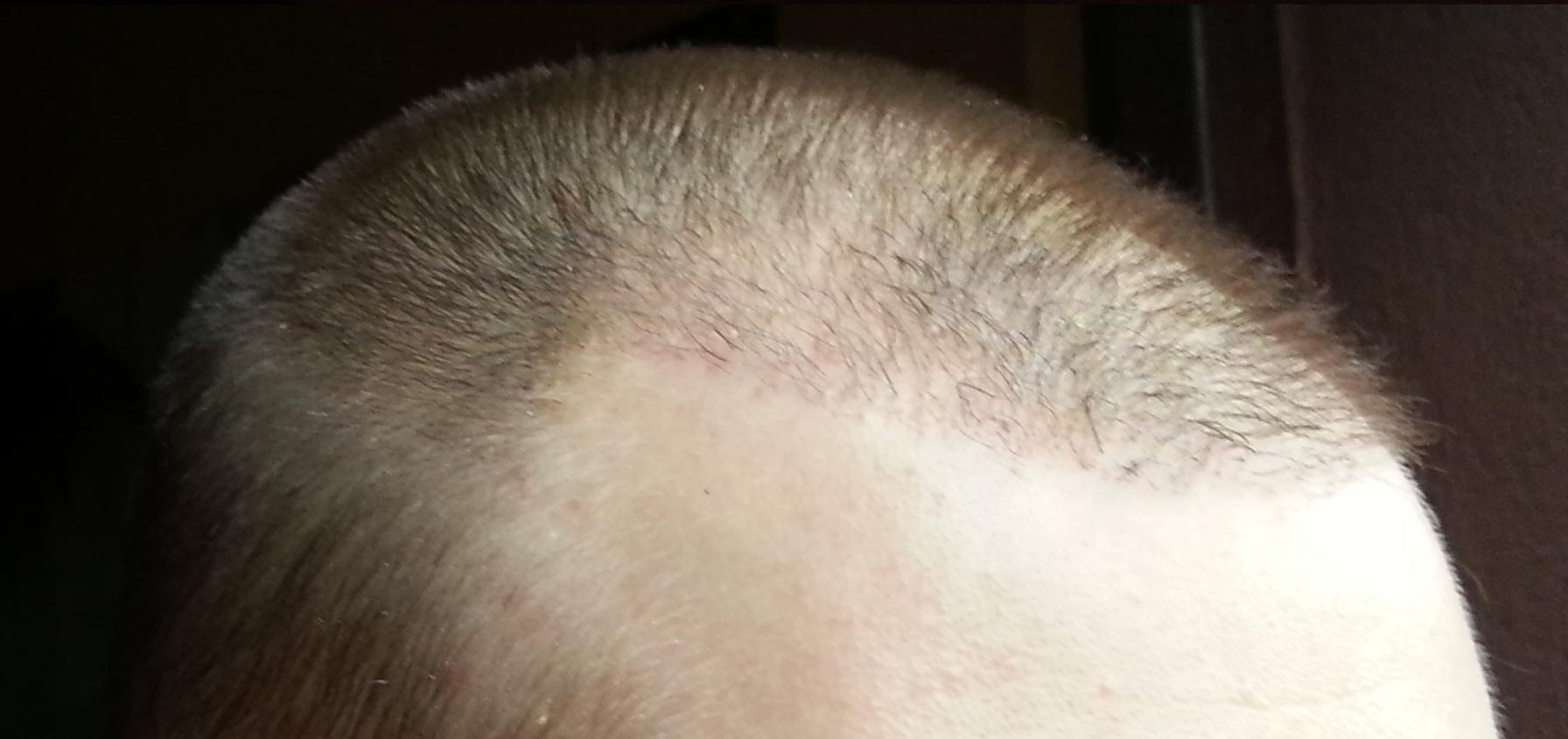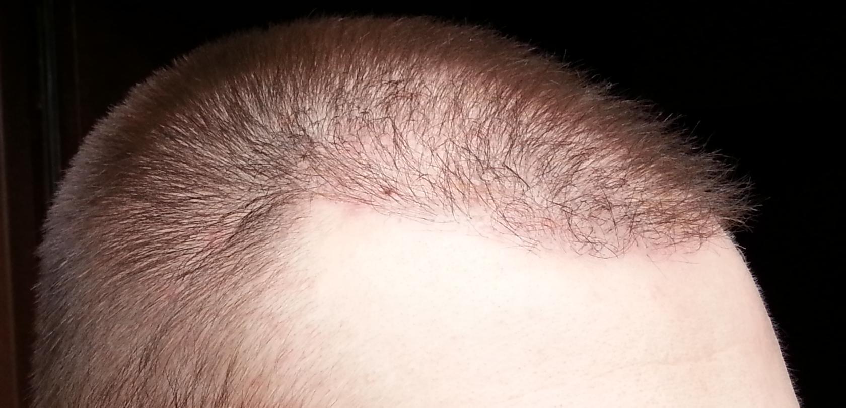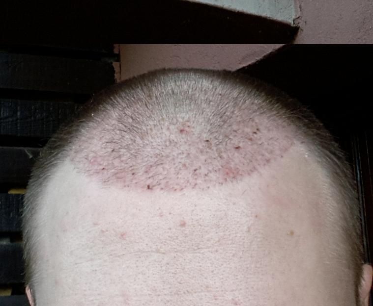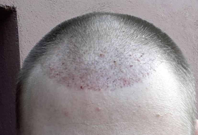 Genau vor 2 Monaten wurde meine OP durchgeführt, daher heute ein kleines Update. Wie man sieht sind die Rötungen nach wie vor deutlich vorhanden. Wenn man von vorne draufschaut geht es halbwegs, aber von oben siehts halt noch schlimm aus... Hab mir gestern mal vorsichtig die Haare gestutzt, das macht es ein wenig erträglicher... Ansonsten sprießen immer mal wieder kleine Eiterpickelchen (erkennt man gut auf dem Bild von oben), die ich vorsichtig ausdrücke oder aufsteche (daher die kleinen roten Krusten). Zu den Transplantaten lässt sich wohl noch nicht viel sagen, winzige Stoppel sind zu erkennen...