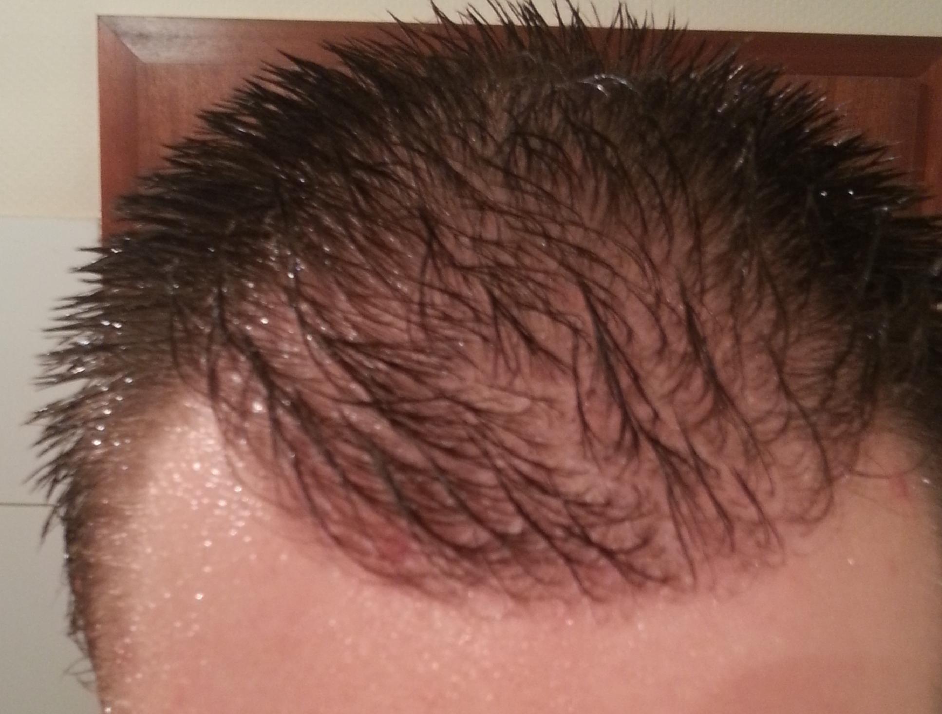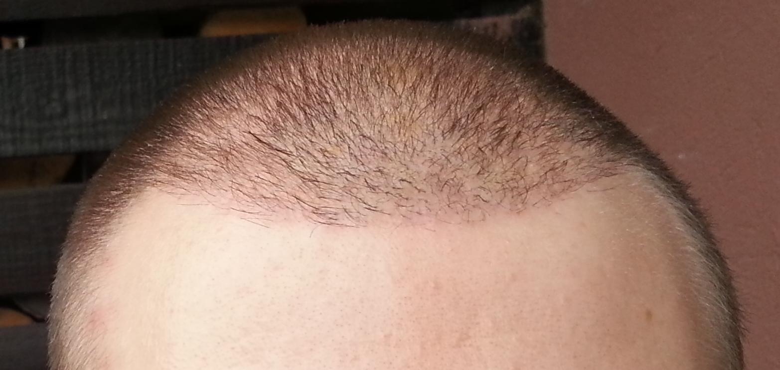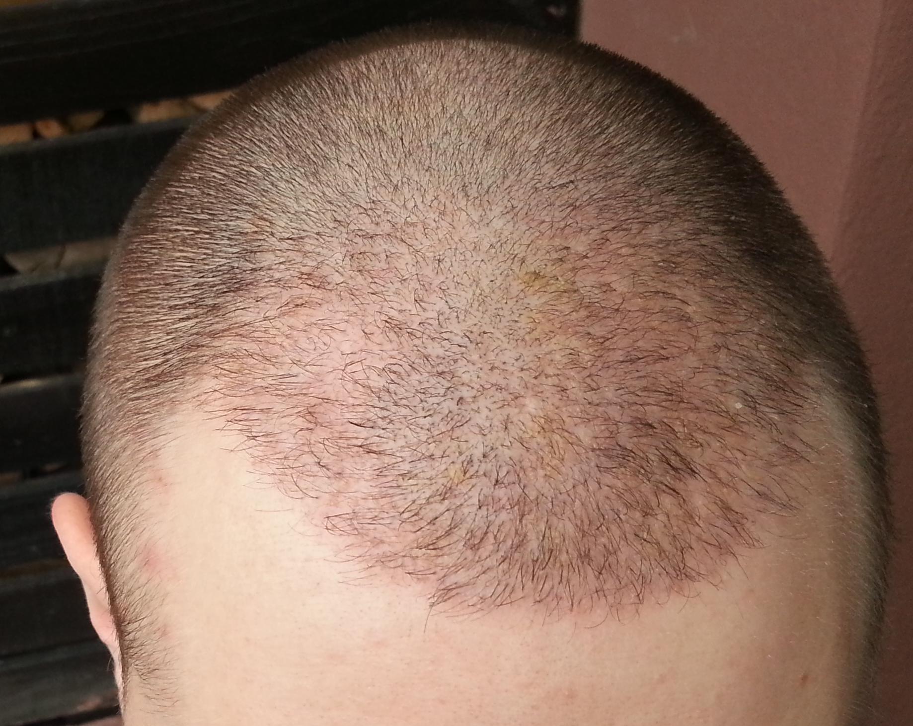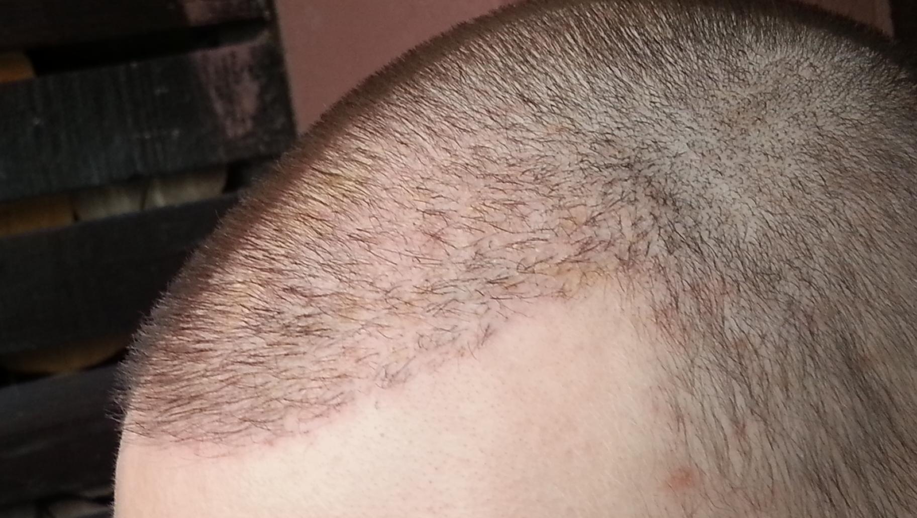 Genau vor 2 Monaten wurde meine OP durchgeführt, daher heute ein kleines Update. Wie man sieht sind die Rötungen nach wie vor deutlich vorhanden. Wenn man von vorne draufschaut geht es halbwegs, aber von oben siehts halt noch schlimm aus... Hab mir gestern mal vorsichtig die Haare gestutzt, das macht es ein wenig erträglicher... Ansonsten sprießen immer mal wieder kleine Eiterpickelchen (erkennt man gut auf dem Bild von oben), die ich vorsichtig ausdrücke oder aufsteche (daher die kleinen roten Krusten). Zu den Transplantaten lässt sich wohl noch nicht viel sagen, winzige Stoppel sind zu erkennen...