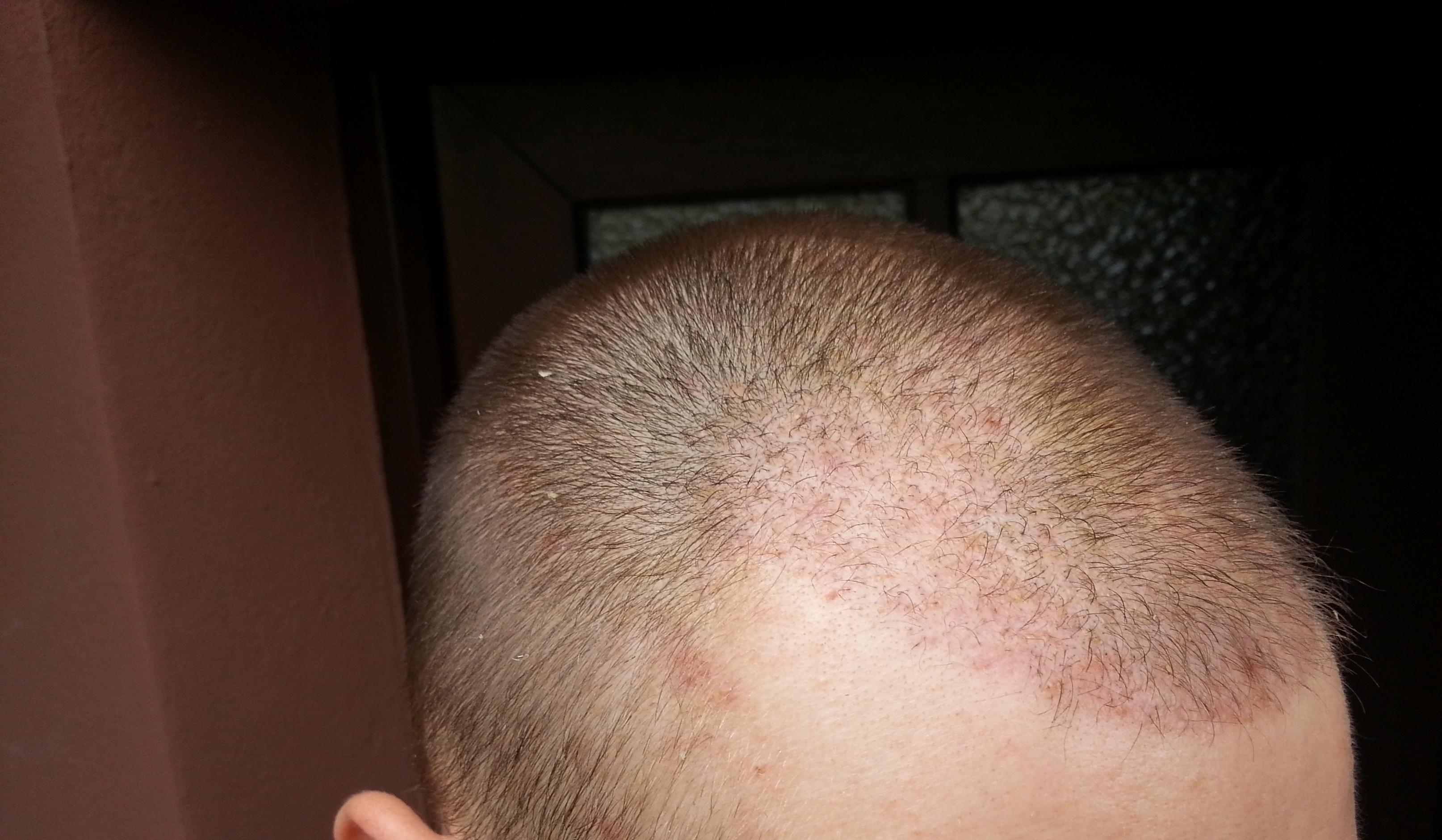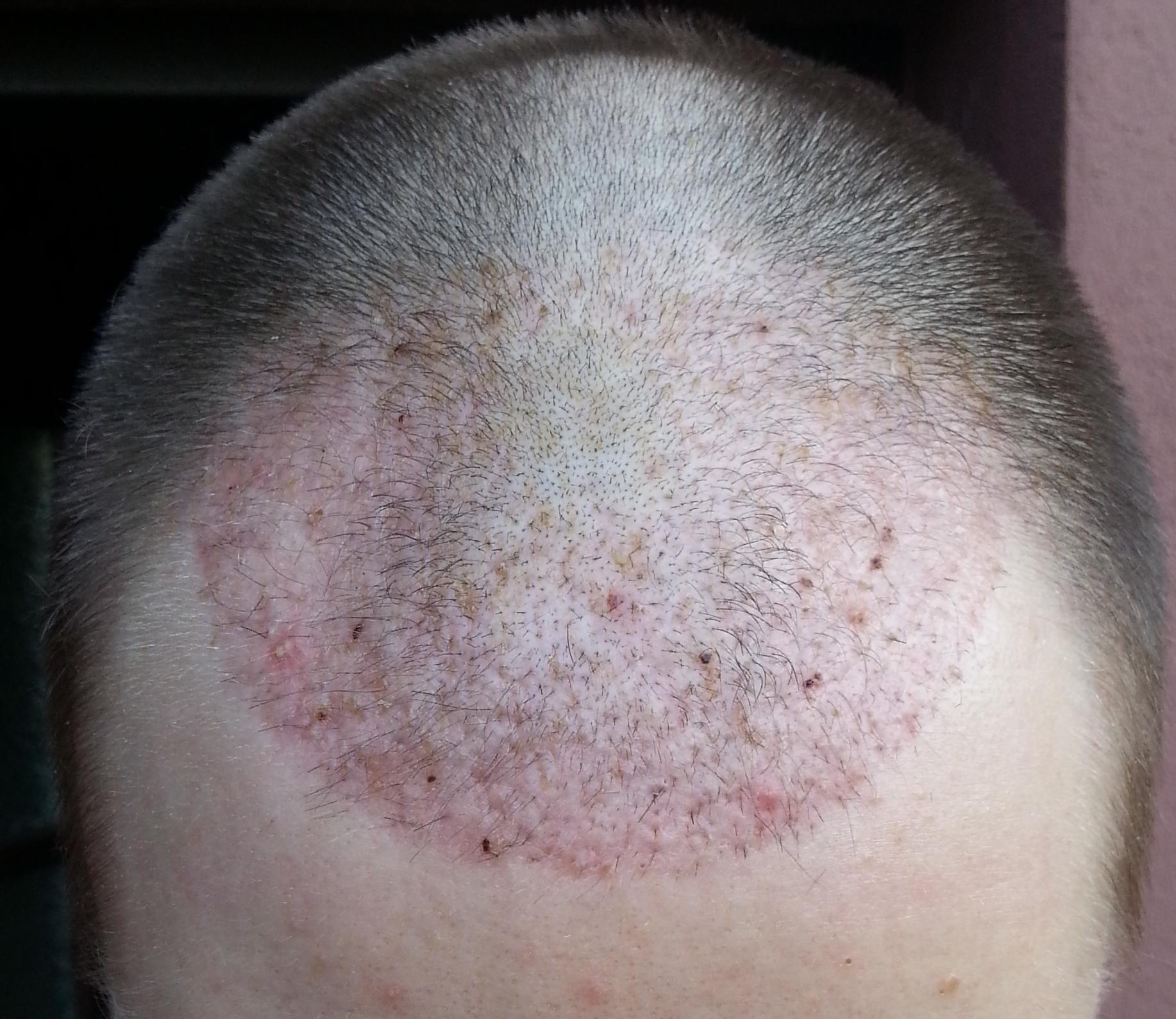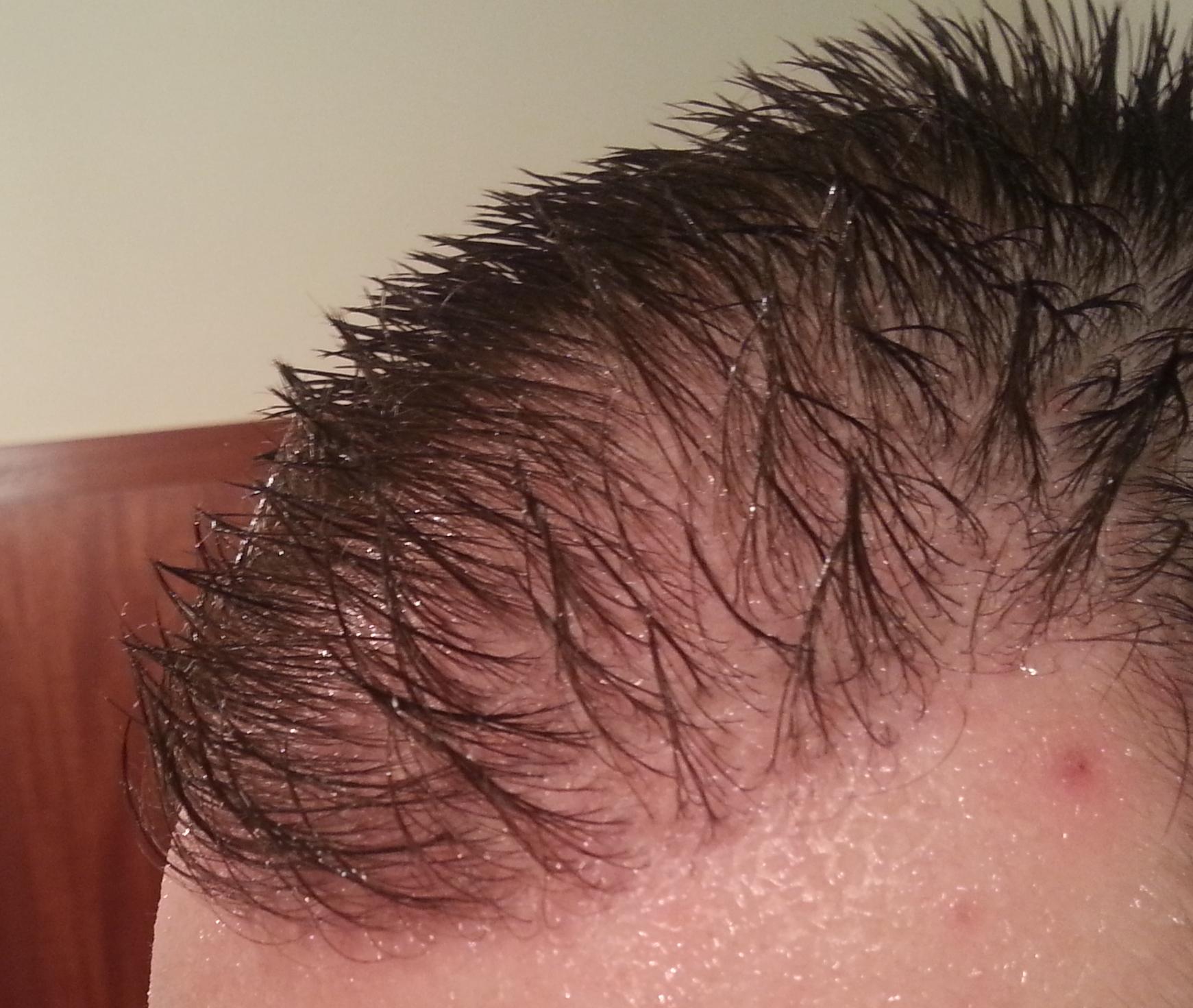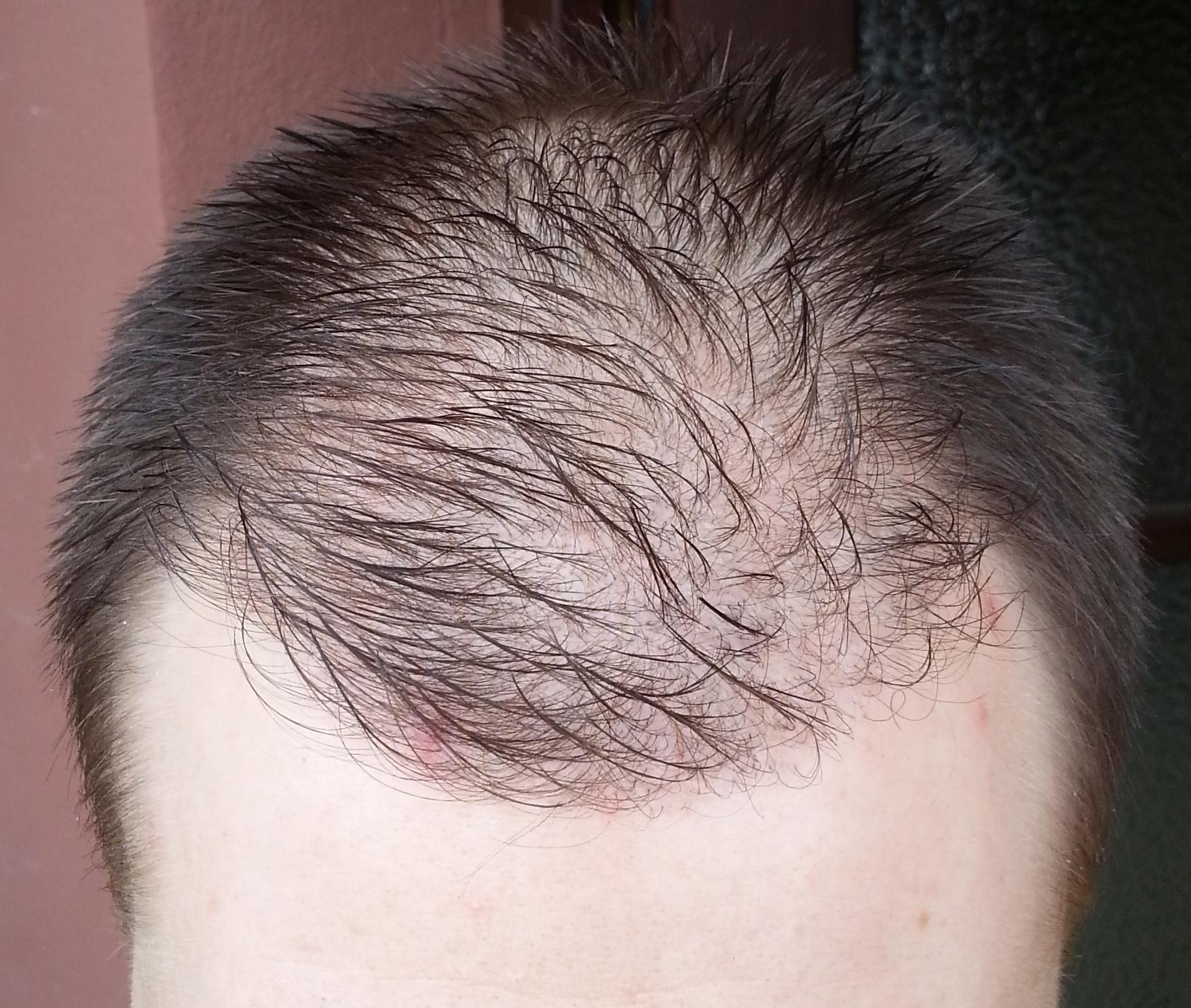 Genau vor 2 Monaten wurde meine OP durchgeführt, daher heute ein kleines Update. Wie man sieht sind die Rötungen nach wie vor deutlich vorhanden. Wenn man von vorne draufschaut geht es halbwegs, aber von oben siehts halt noch schlimm aus... Hab mir gestern mal vorsichtig die Haare gestutzt, das macht es ein wenig erträglicher... Ansonsten sprießen immer mal wieder kleine Eiterpickelchen (erkennt man gut auf dem Bild von oben), die ich vorsichtig ausdrücke oder aufsteche (daher die kleinen roten Krusten). Zu den Transplantaten lässt sich wohl noch nicht viel sagen, winzige Stoppel sind zu erkennen...