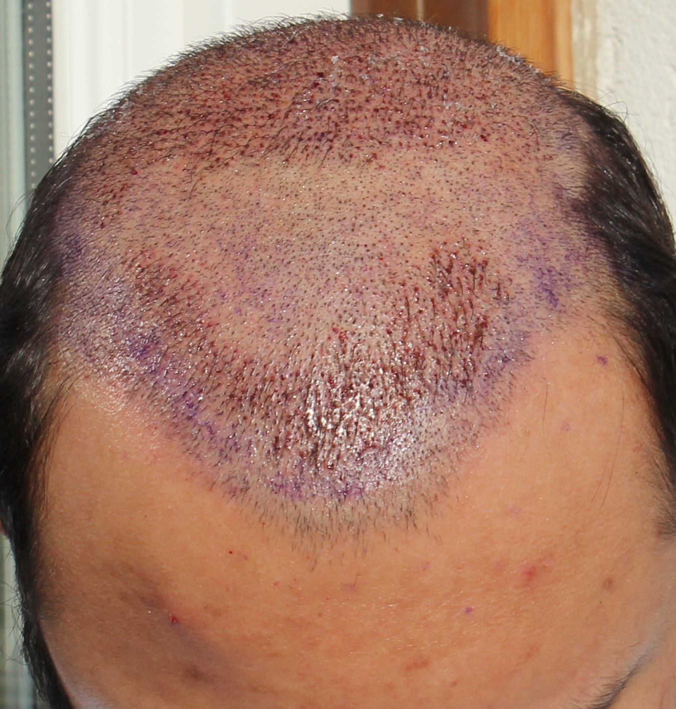 ich wollte euch meine dritte HT am 07.12.2012 nicht vorenthalten. Inzwischen bin ich ein Jahr Post OP und mit dem Ergebnis zufrieden. Genauso wie meine zweite OP hatte ich auch die dritte OP in Schaffhausen bei Hattingenhair. Hauptziel des Ganzen war es, die Tonsur weiter zu verdichten. Diese hatte sich bereits vor der zweiten OP stark vergrößert. Demnach war es nicht möglich eine zufriedenstellende Dichte mit nur einer Behandlung zu erreichen. Ich habe 2580 Grafts transplantiert bekommen- ca. 2000 davon wurden in die Tonsur zur Verdichtung eingepflanzt. Der Rest davon ging in den Frontbereich hinter der Stirnhaargrenze. Die Anwuchsrate in der Front war bei mir, wie in allen anderen OPs, deutlich besser als im Tonsurbereich. Ich denke nicht, dass es dort bei mir noch recht viel besser gehen wird- zu hoch das Risiko vor Shockloss in einer erneuten Behandlung. Deshalb hoffe ich, dass die dünnen Haare dort noch dicker werden. Schließlich benötigen die Haare im schlechter durchblutenden Tonsurbereich einfach länger. Meine Narbe ist ein bisschen besser geworden als nach der zweiten OP. Nicht nur aufgrund meines Alters (30J.)- sondern auch wg. meiner hyperelastischen Haut, wird sich das Ergebnis aber nicht sonderlich viel besser ausüben lassen. Man könnte vermutlich erst nach 10 Jahren davon ausgehen, dass sich meine Haut ein wenig strafft. Dann wäre auch das Narbenergebnis besser. Denn auch nach meiner dritten OP ist mein Donorbereich nahezu so elastisch wie vor der ersten OP.