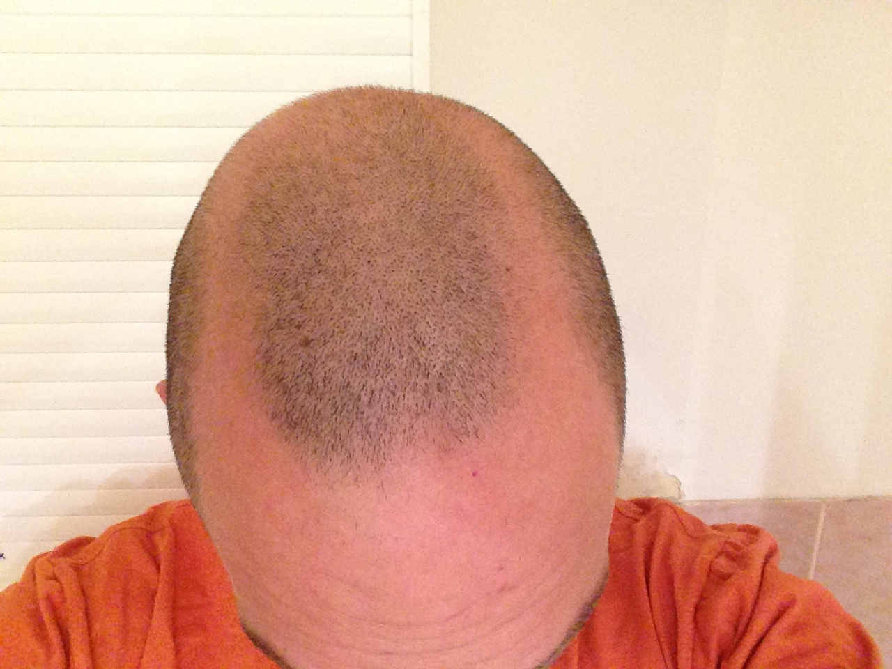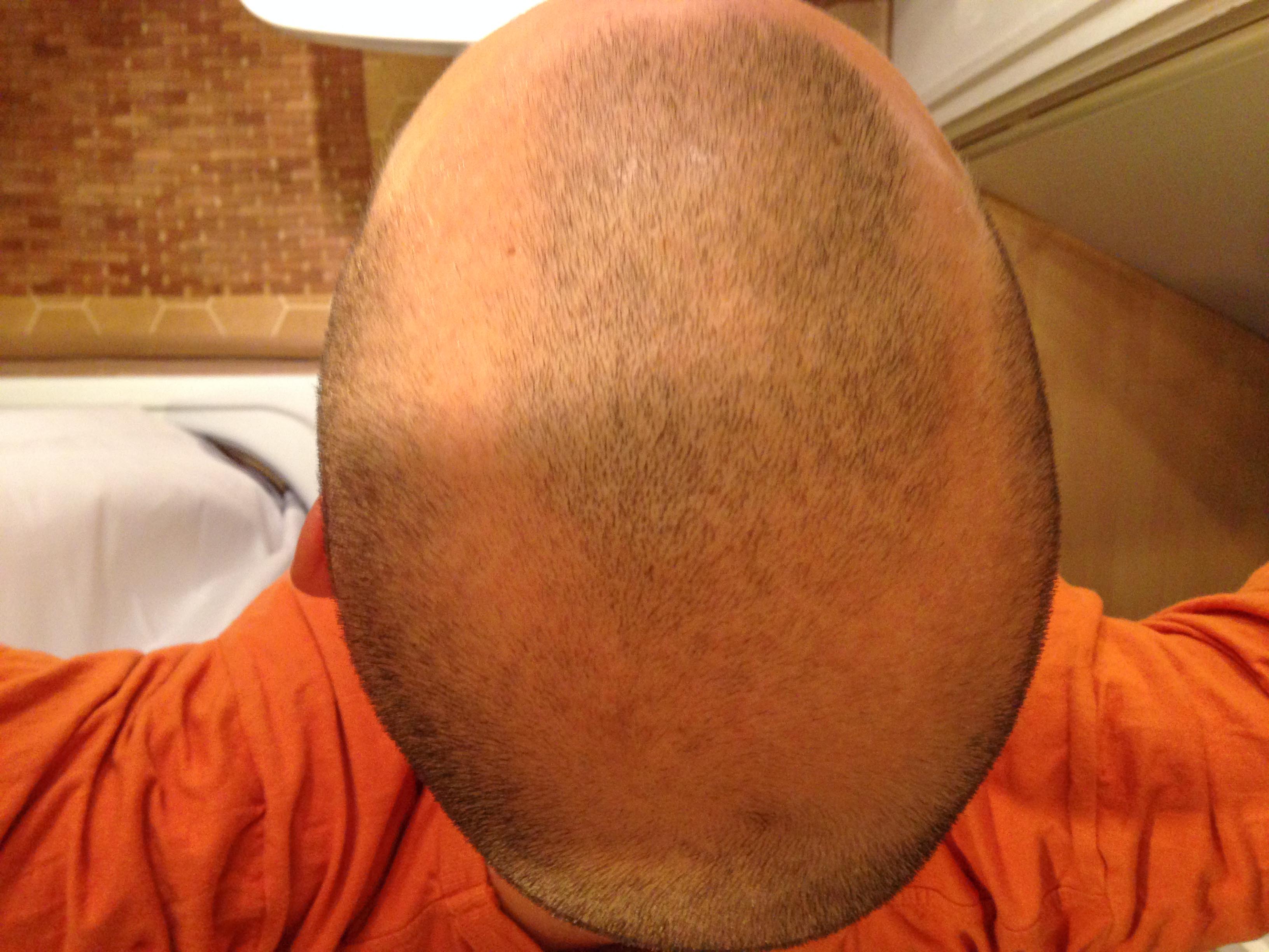 Mittlerweile rasiere ich am ganzen Kopf immer so auf 2mm runter (s. Bilder). Wie man sieht, ist da mittlerweile schon ziemlich viel freie Fläche am Kopf. An den behaarten Stellen ist das Haar jedoch normal dicht.