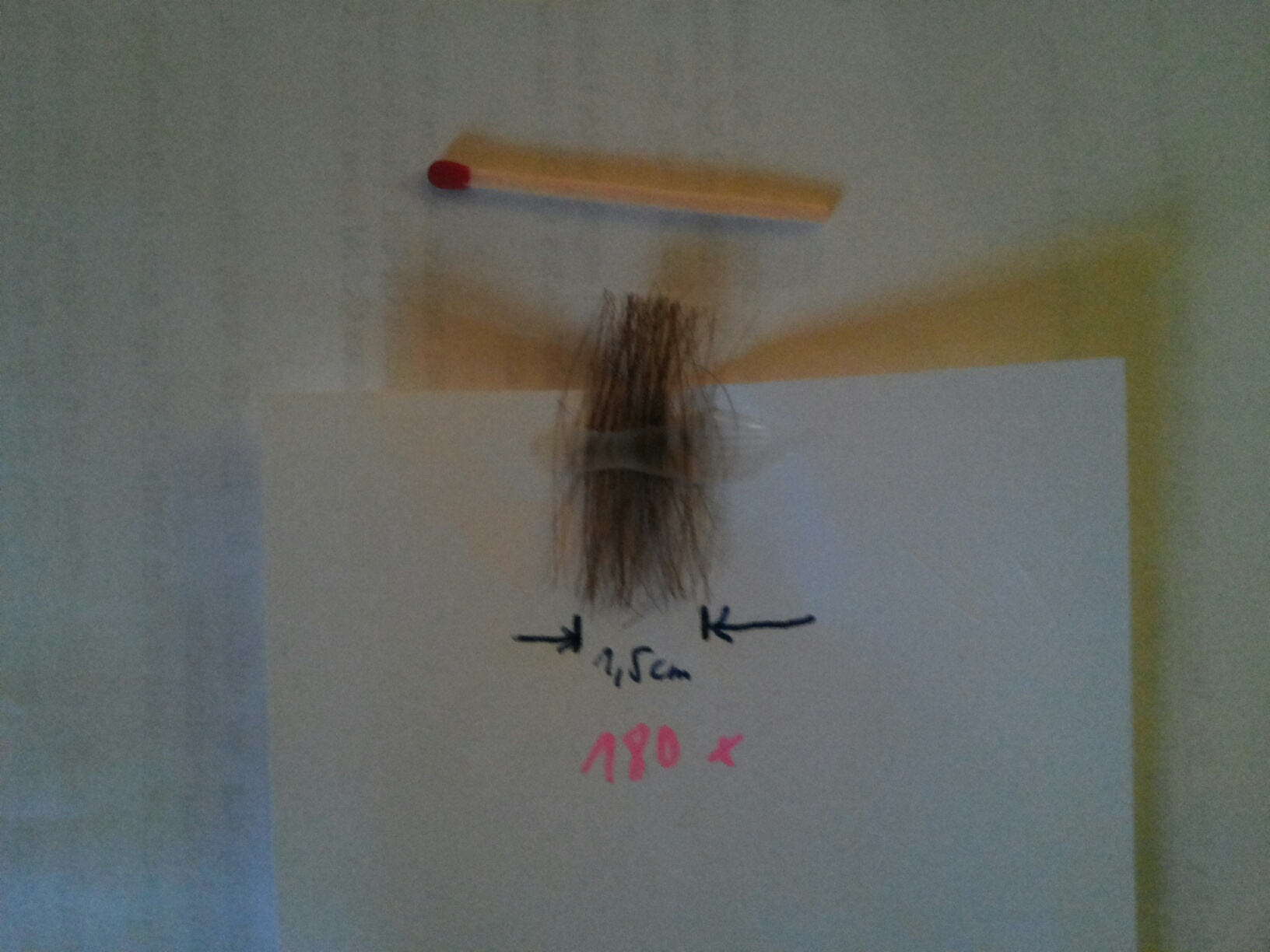 anbei ein bild. das sind abgezählt 180 haare. die ausgelegte breite sind 1,5 cm. und nun rechne das in deinem fall bei 3000 haaren hoch. das wre das 16 fache auf eine breite von 24 cm im schlechtesten fall. oder bei 4000 haaren das 22 fache auf einer breite von 33 cm !