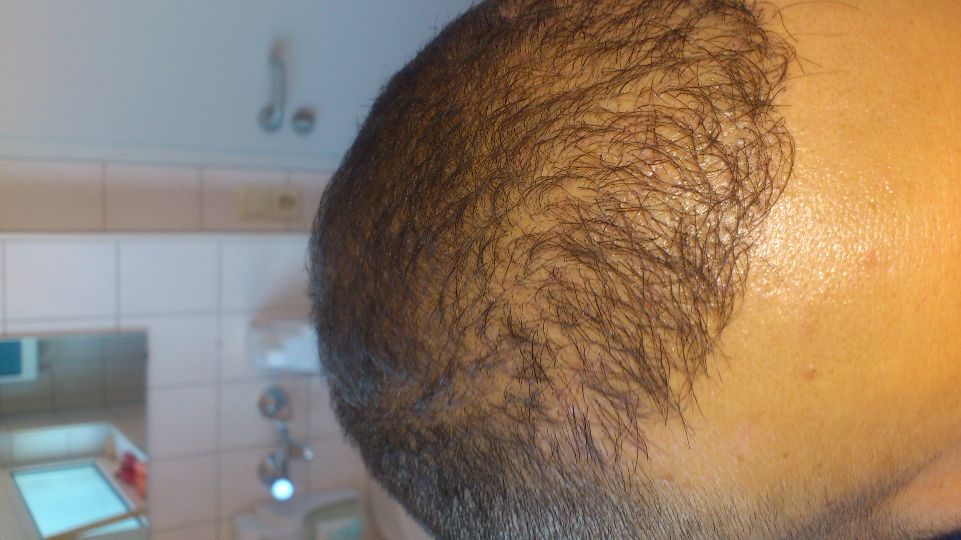 Ich finde für ein Zwischenergebniss sieht das schon ganz gut aus, die transplantierten Haare sind schon wesentlich dicker und Dichter geworden.