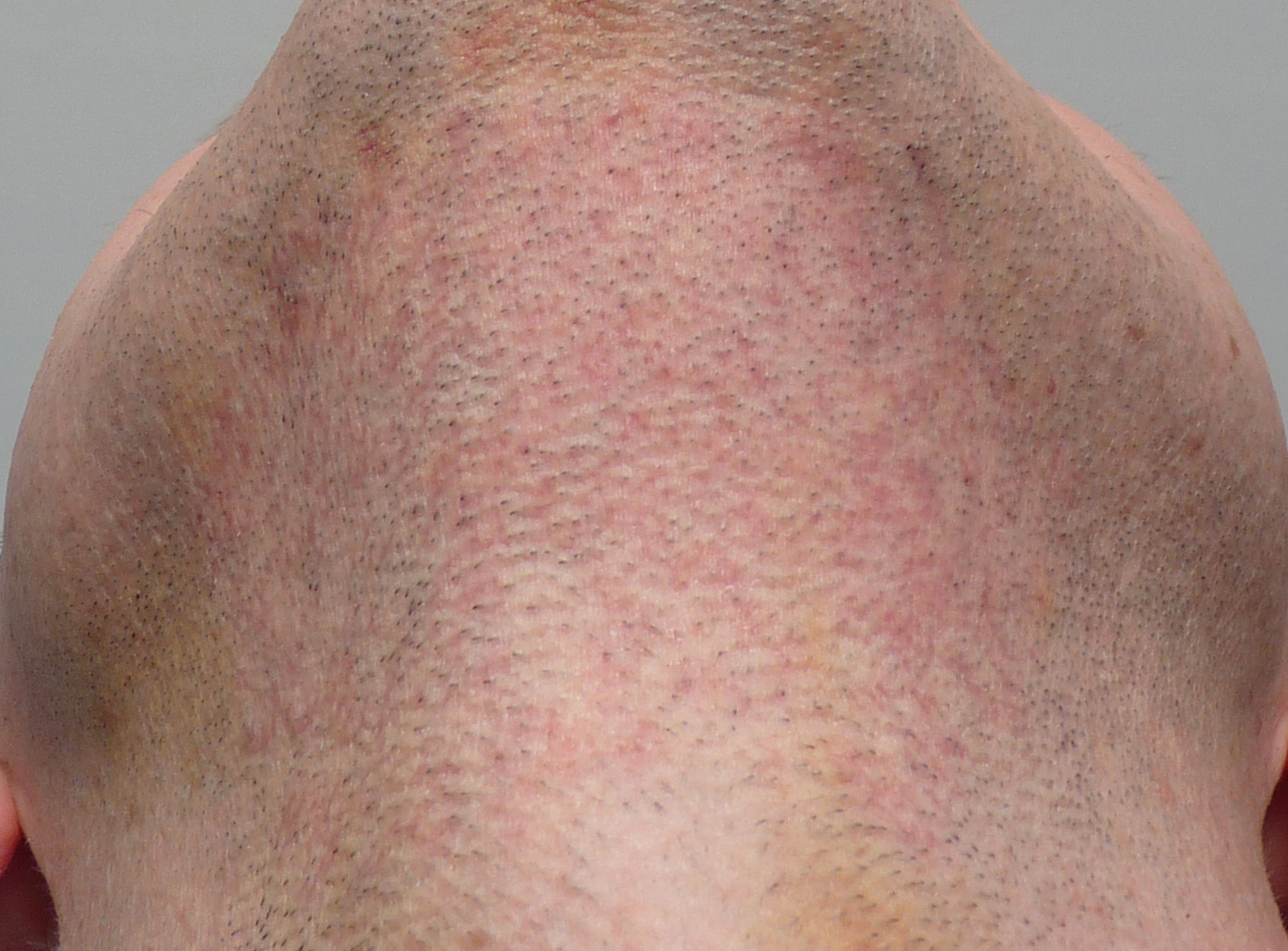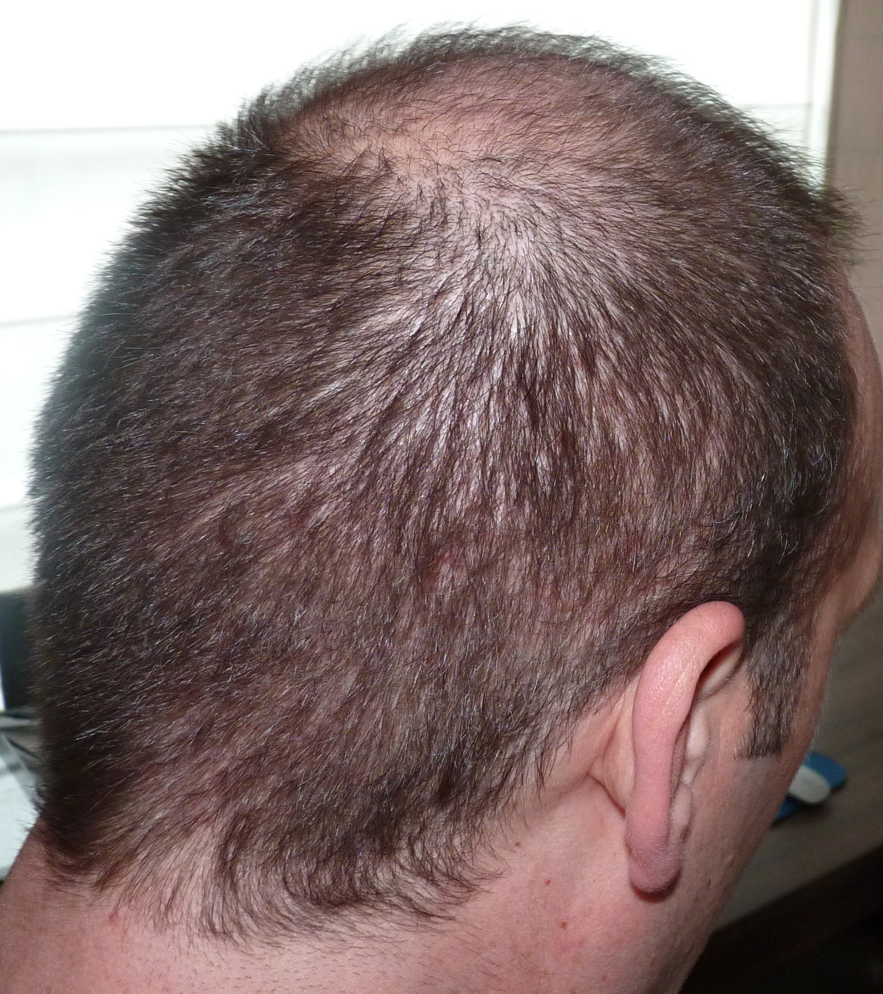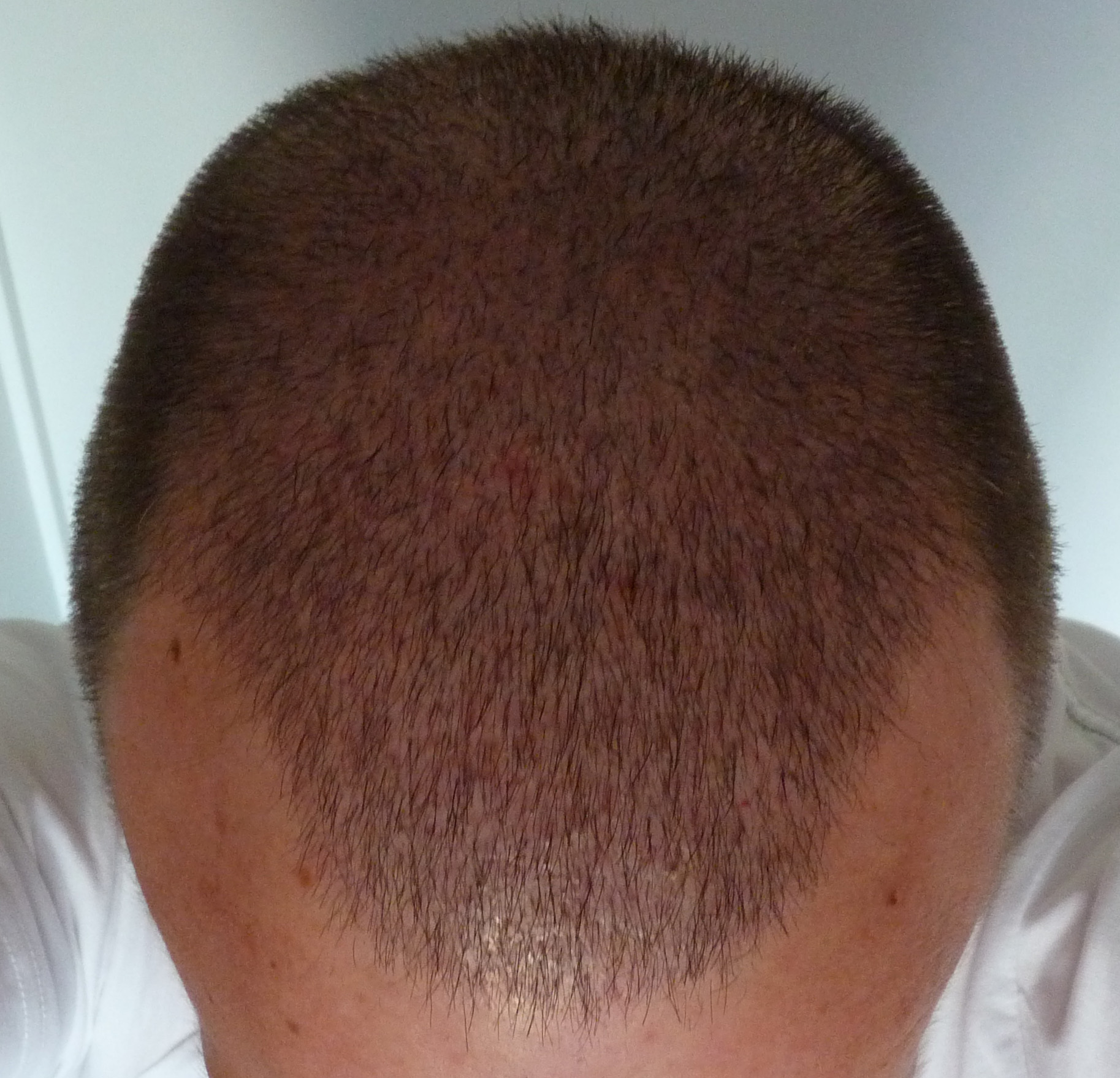 2 Monate nach der HT. Der Spender Gebiet ist sehr gut restauriert, es ist fast keine Spur von einem HT mehr zu Sehen. In der Implantation Zone ist die schocklos deutlich sichtbar. Ich hoffe auf ein gutes Nachwachsen in den kommenden Monaten.