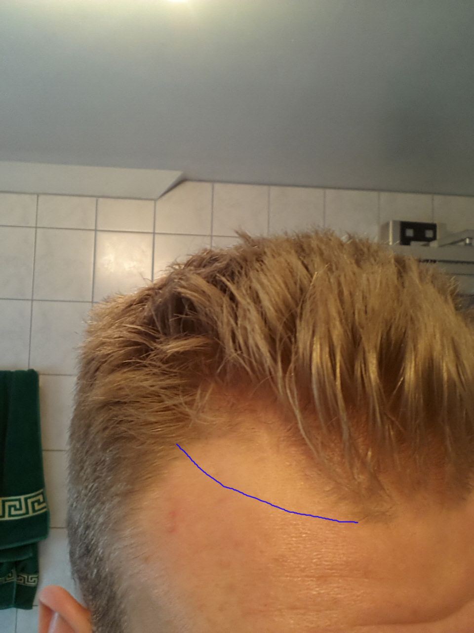 Wie ihr seht leide ich unter Geheimratsecken, welche am Ansatz (in den Ecken zur mitte hin) dünner werden.