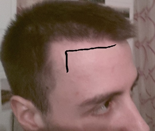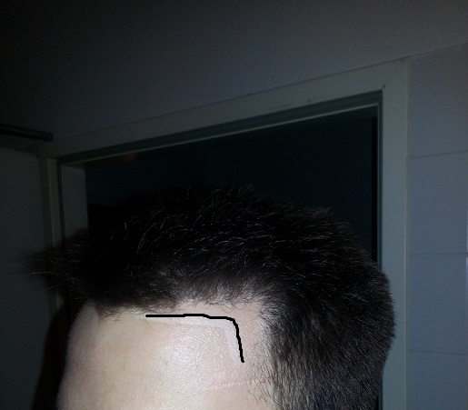 Der Haaransatz auf der Seite wirkt auf meinen Bild ein wenig ausgedünnt. Das liegt daran, dass ich das Schläfendreieck immer wieder abrasiere, weil es so symmetrischer und nicht ganz so hoch wirkt.