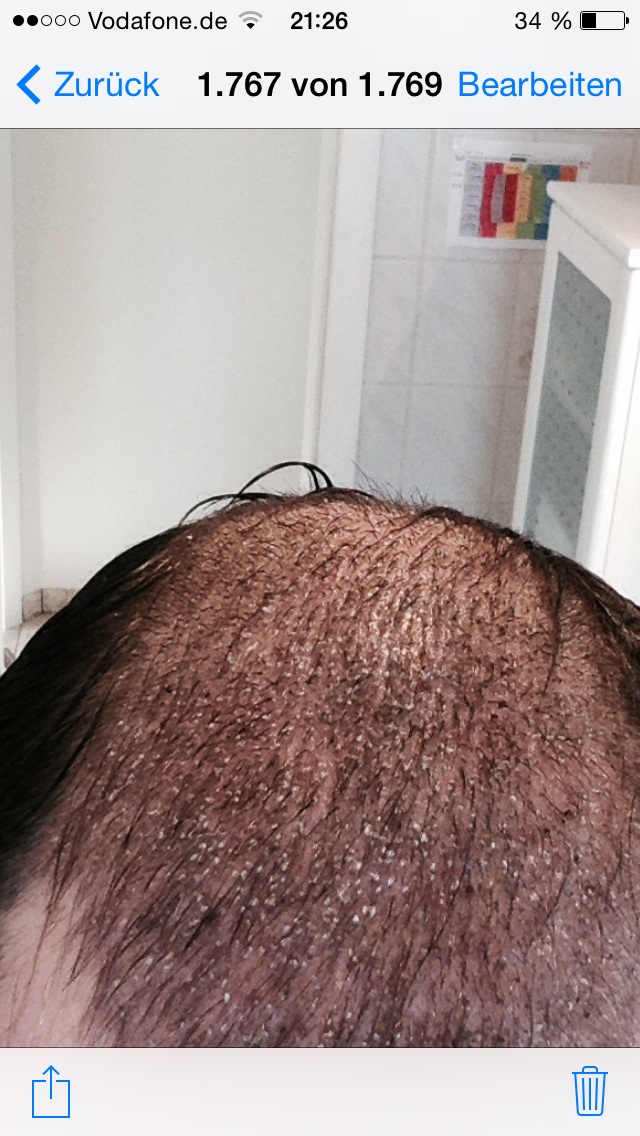 Die auf dem dritten Bild zu sehenden weißen Knubbel sind noch Restbestände der Krusten. Sah bei mir genauso aus und sollte nicht mehr länger als zwei Haarwäschen lang dauern bis sie vollständig vom Kopf entfernt sind.
