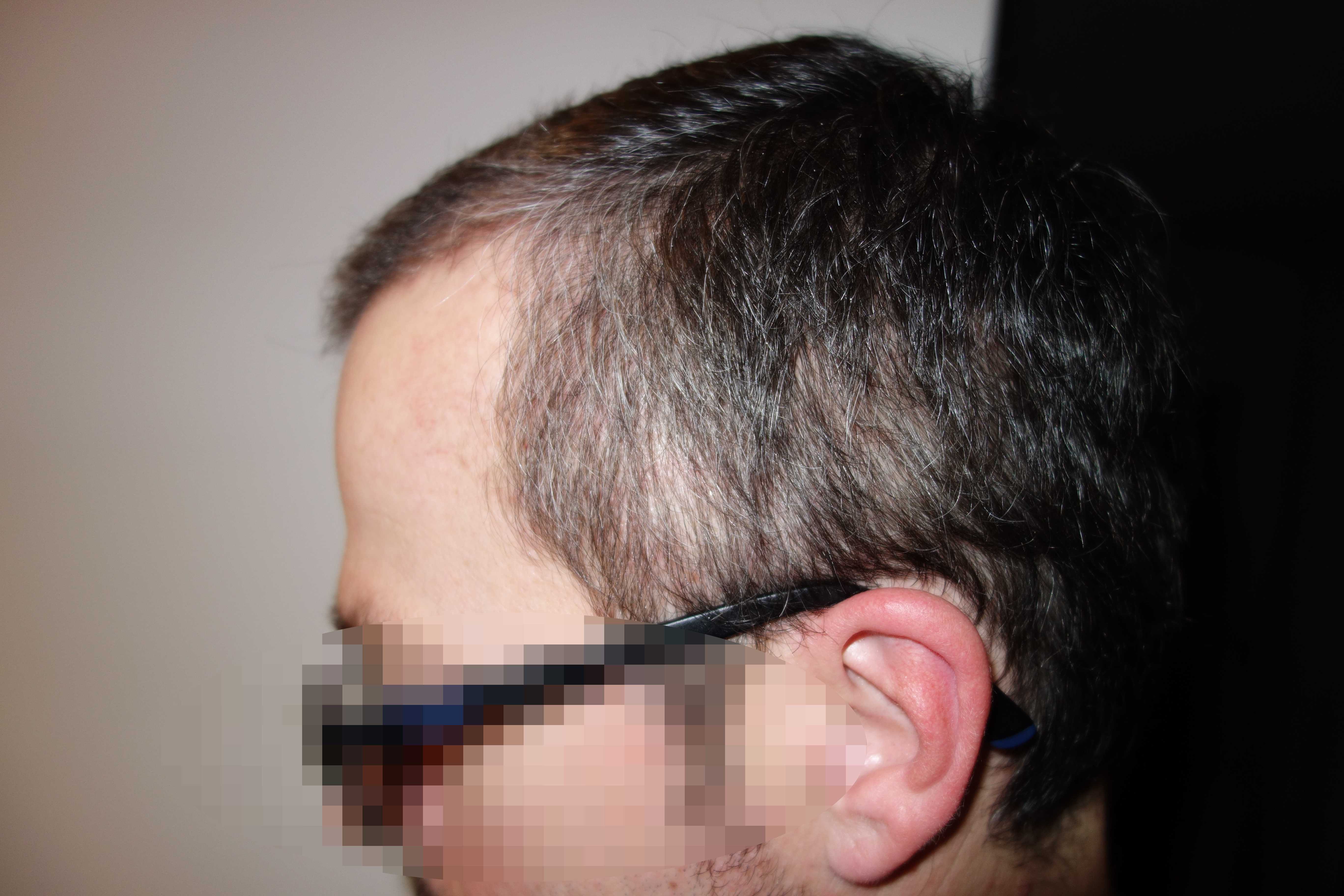 Entlang der Narbe wie auch im Empfangsgebiet hatte ich ja einen erheblichen Shockloss. An der Narbe kann ich schon die ein oder anderen Stoppel ertasten und es sieht bis auf die linke Schädelseite sehr dicht aus. Die linke Seite sieht noch ein wenig fleckig aus, da hier neben der Narbe auch an der Schläfe gearbeitet wurde. Aber auch hier ertaste ich einige Stoppel. Da es sich beim Schockloss um das ursprüngliche Haar handelt ist die Wachstumskurve nicht gleich zu setzen wie mit den gesetzten Grafts lt. Haarwachstumskurve also braucht das noch was Zeit.