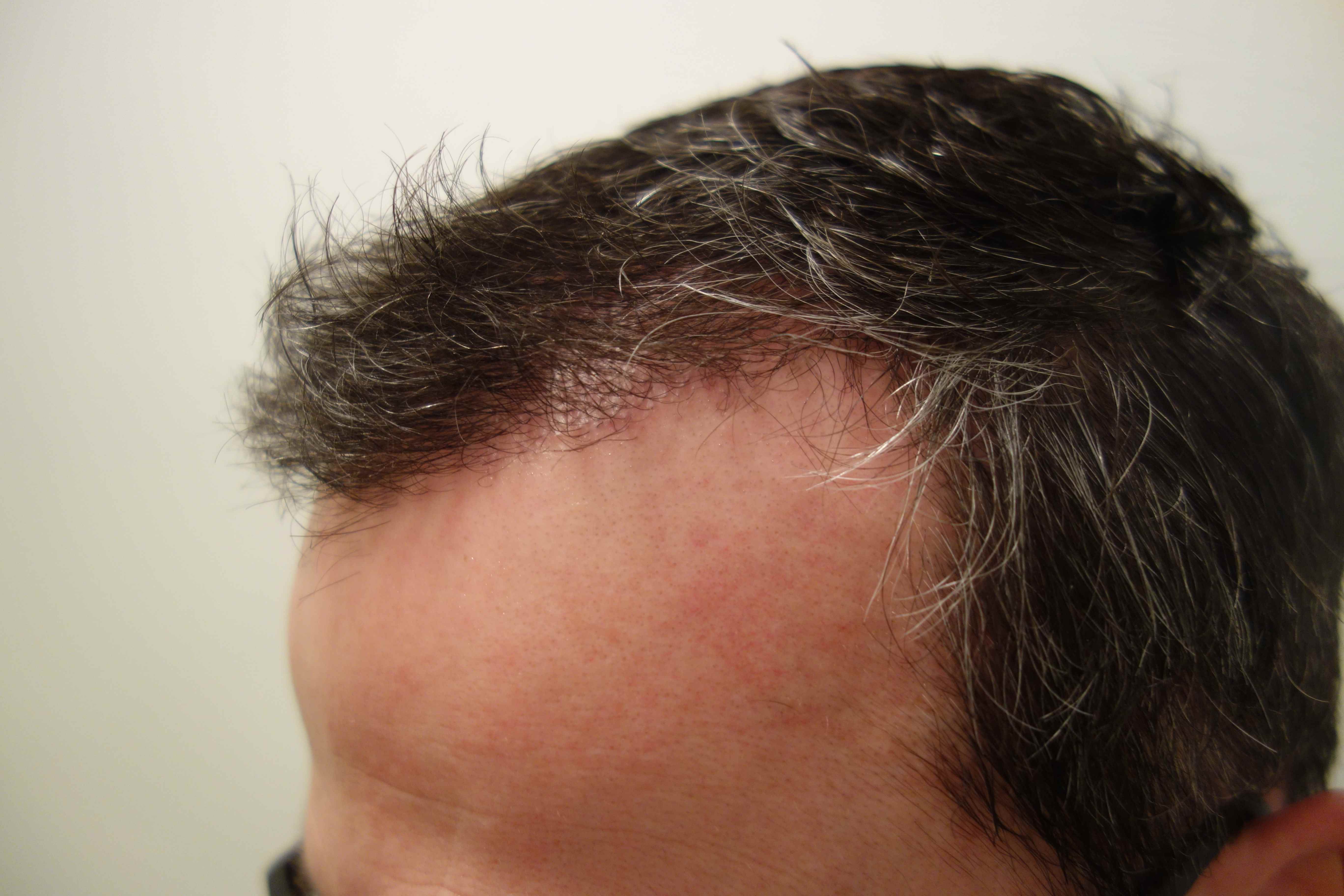 Einziges Manko, was ich gestern Abend zu Hause gesehen habe ist, dass die transplantierten Haare im Schläfenbereich sich borstiger anfühlen und auch dunkler sind. Da ich aber eine herbstliche Farbgebung auf meinem Kopf habe (dunkelbraun - hellbraun - weiß) und auch die Dichte da sehr variiert (lag nicht an der HT, war schon vorher so) ist das für andere nicht wirklich sichtbar. Aber Tatsache ist, dass der Schläfenbereich sich vom restlichen nativen Haar unterscheidet.