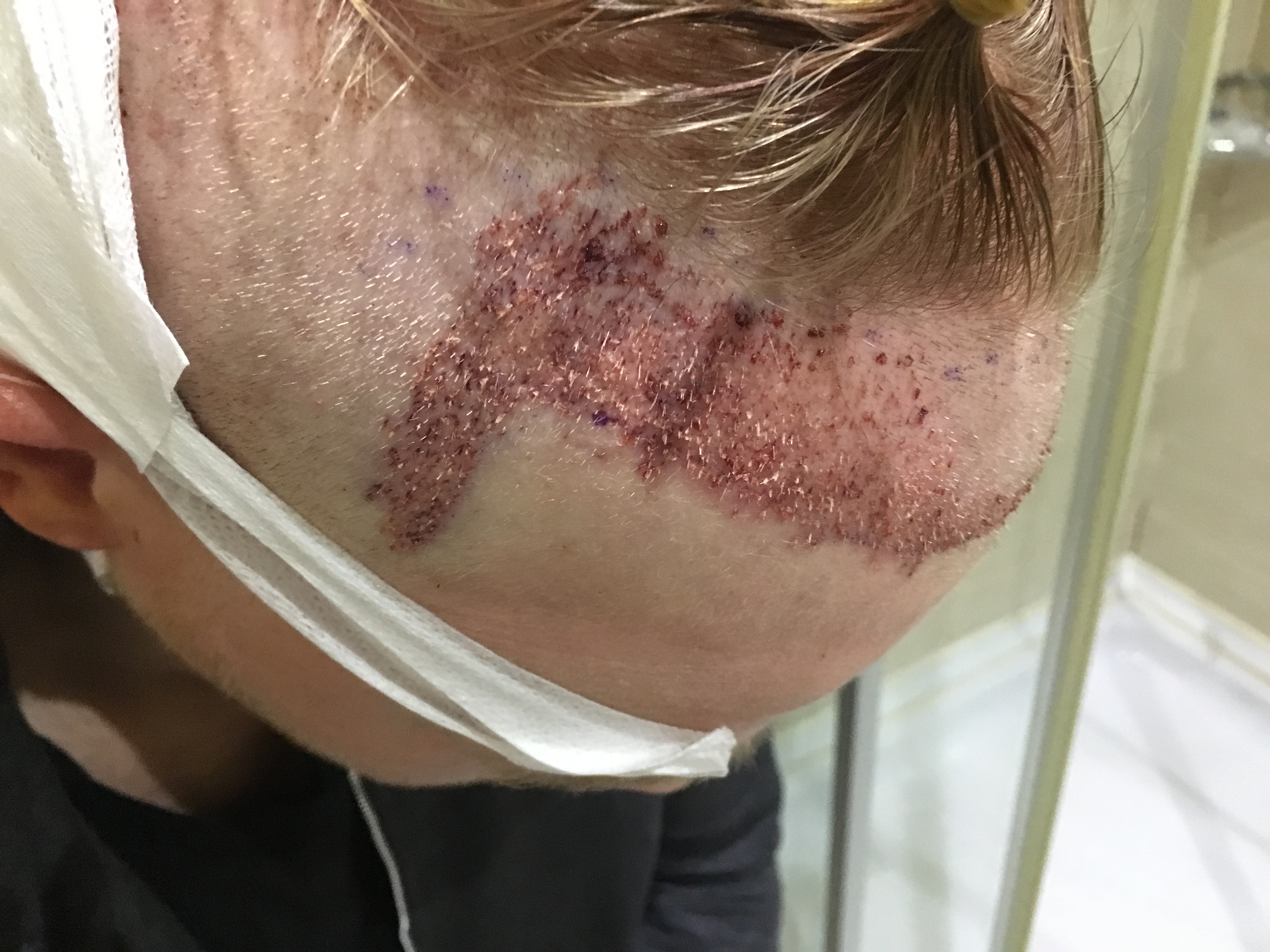 Als alles entnommen wurde kam Dr. Bicer wieder und machte die Schlitze für die neue Haarlinie.