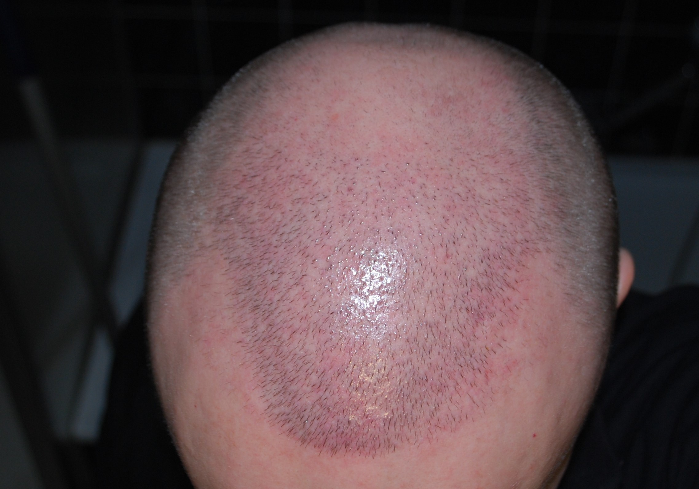 Hier das Ergebnis des ersten Tages bei Reys. Die Geheimratsecken wurden ausgepuncht. Die zweite Ladung Grafts ist in die Mitte verschwunden.