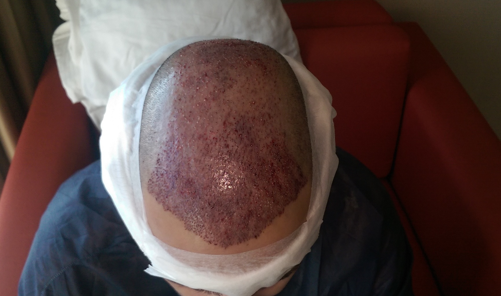Die Entnahme wurde mit Mikromotor durchgeführt und es sollen 3000 Grafts entnommen und eingesetzt worden sein. Hier könnt Ihr 1 Foto von der damaligen Behandlung sehen. ( Weißer Verband um den Kopf)