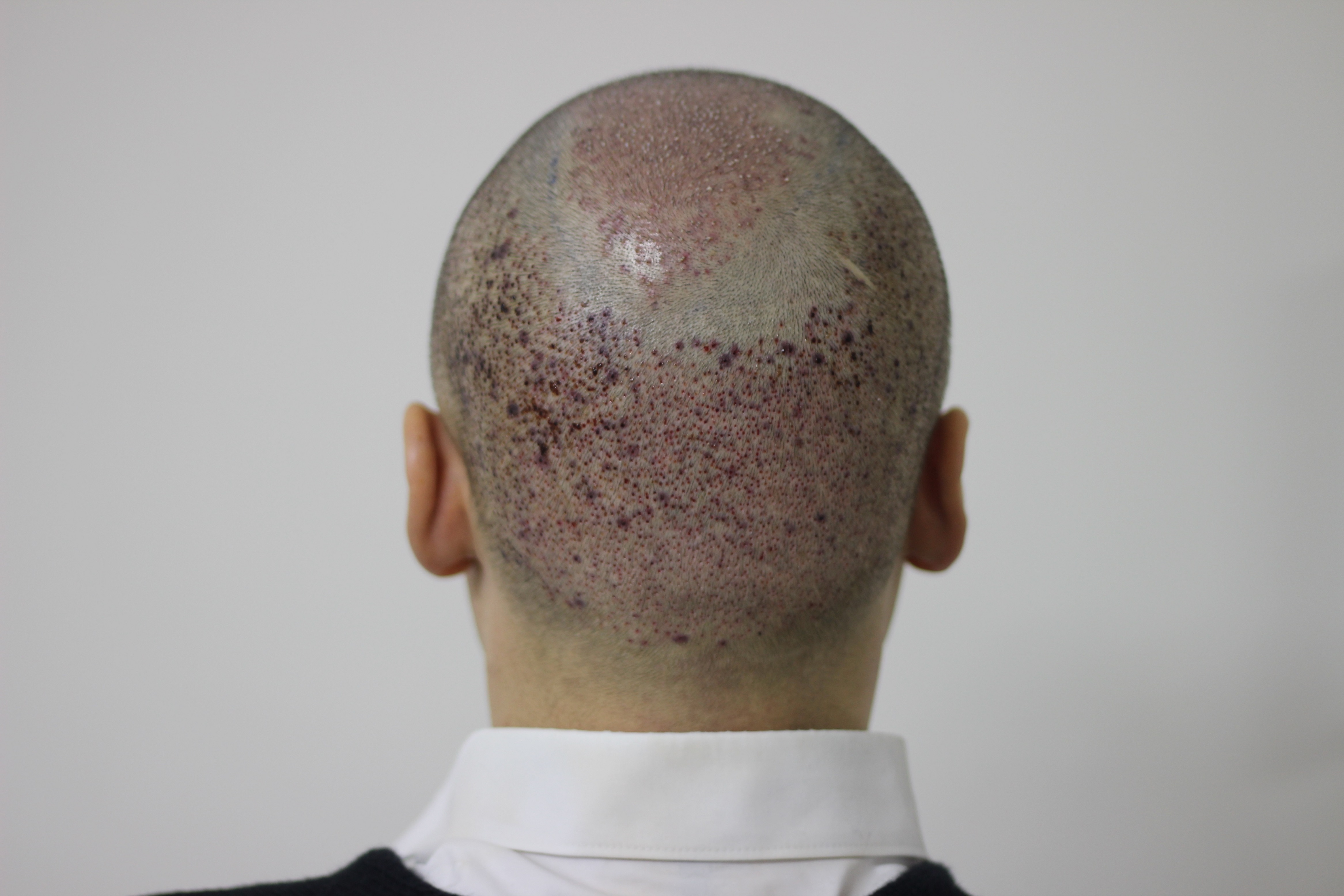 Wie am ersten Tag. Jedoch Entnahme am Hinterkopf. Grafts dann der Rest (ca. 2000). Einsatz in der Midline und am Vertex sowie auch weitere in der Front.