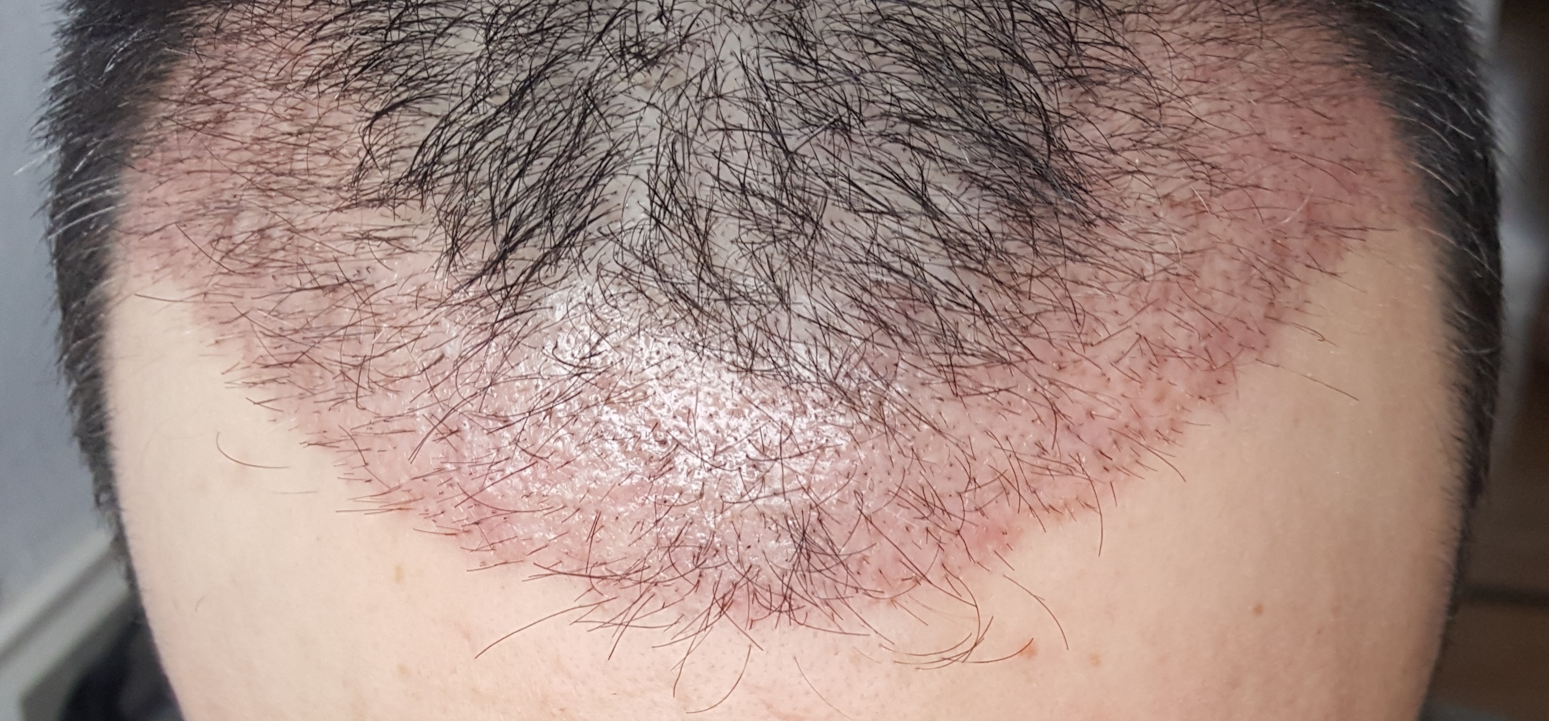 Erstmal moechte ich sagen das du von der Haarstruktur, Reserven, Alter wirklich der perfekte Kandidat fuer eine HT bist/warst. Die gesetzte Dichte schaut aehnlich wie meine aus. Ich denke die von Dir gewuenschte 50er Dichte wurde gesetzt, da kannst du dich schonmal auf ein schoenes Ergebnis freuen! Mir gefaellt die Haarlinie auch, sehr stimmig.