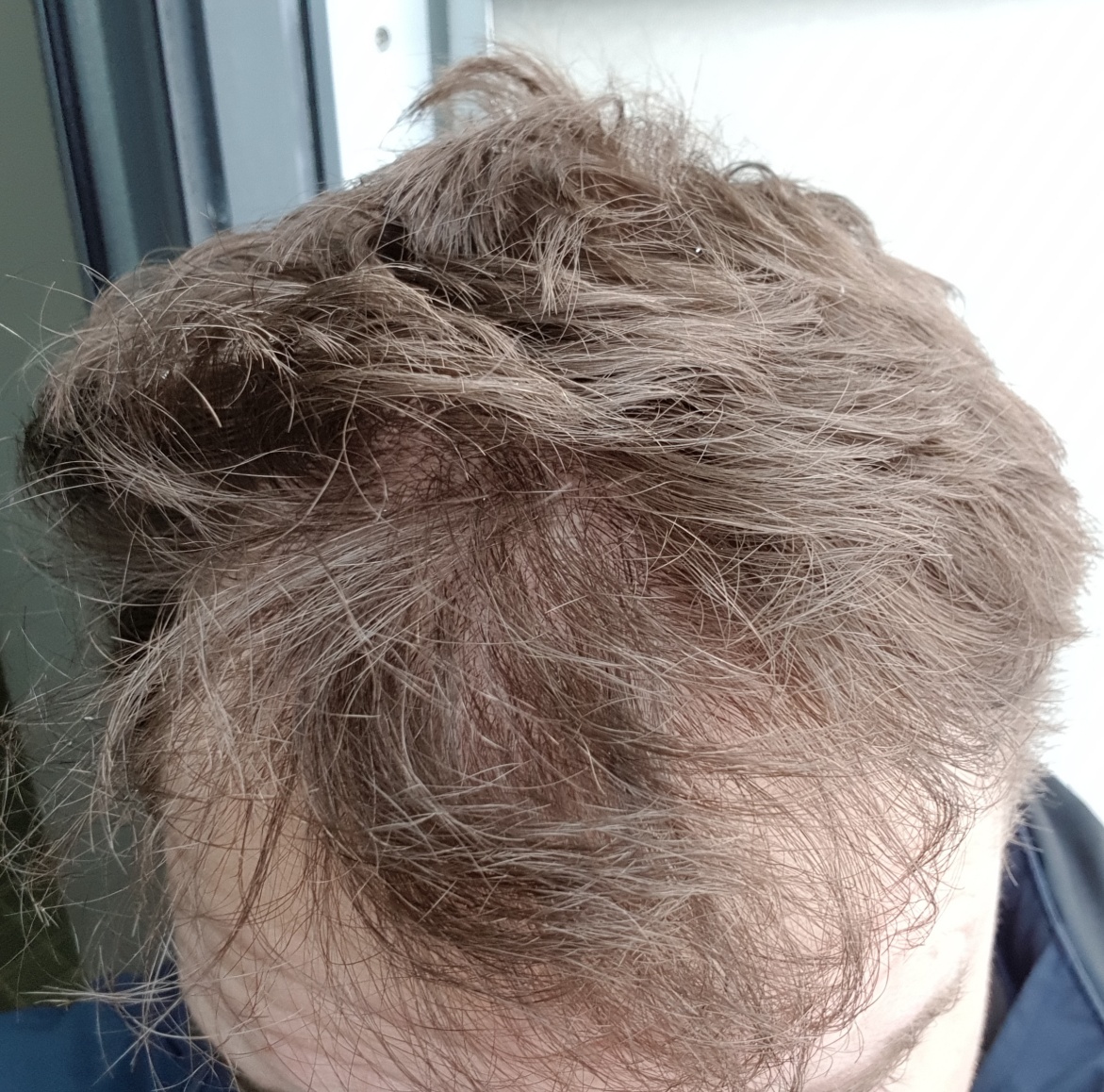Der Krausi war ein NW4 mit Tendenz zu NW5. Das Ziel war nicht ein NW0 wiederherzustellen, sondern seine Halbglatze zu ereledigen und die Sitzung so zu gestalten so das es trotz weiteren Haarverlust immernoch auf eigene Beine stehen kann ohne die Notwendigkeit eine weitere Sitzung zu machen.