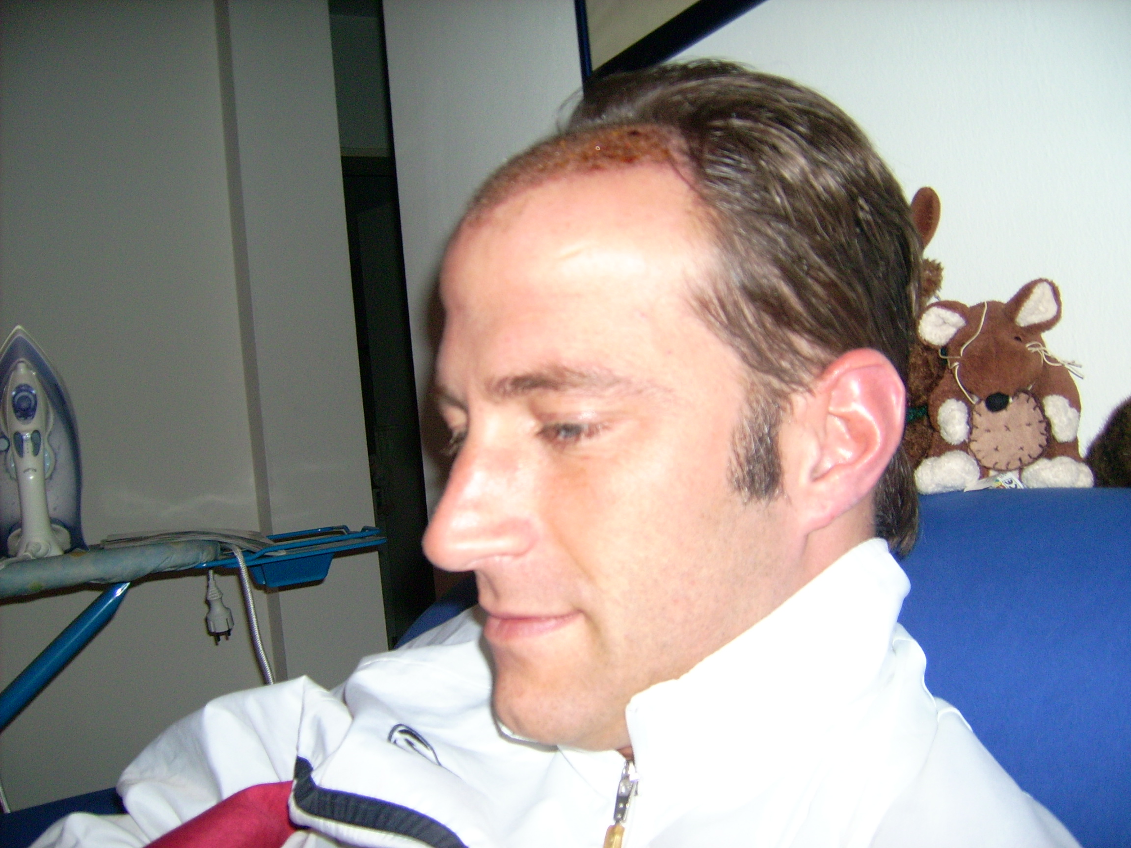 Nun ging ich, ausgestattet mit zwei verschieden Kopfbedeckungen, in die Klinik, wo wiederum die Haarlinie eingezeichnet, Tabletten eingenommen und abschliessend die Vorher-Bilder gemacht wurden.