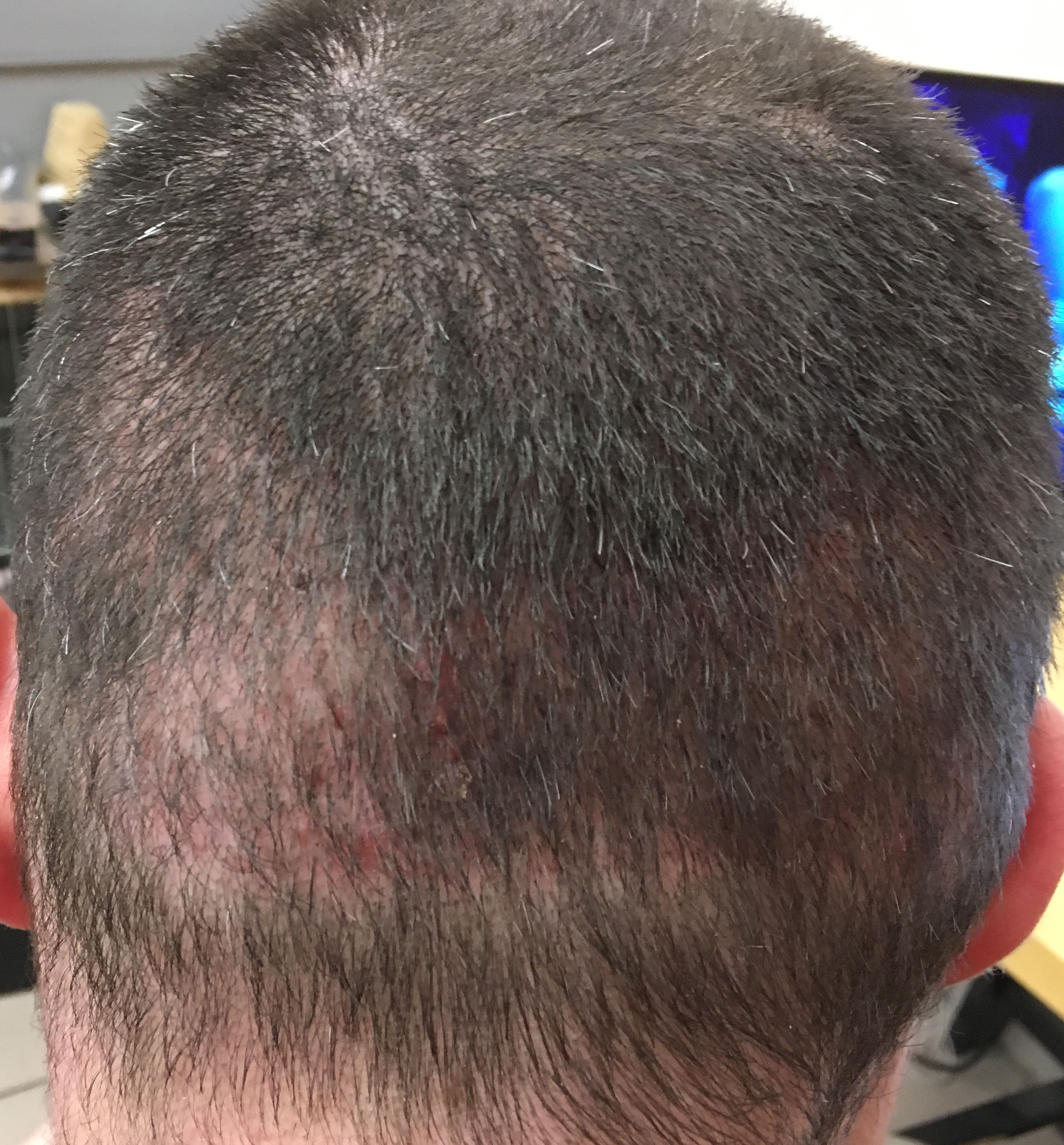 Der Stand des Empfängerbereichs nach zwei Wochen sah meiner Meinung nach schon sehr sehr gut aus. Leider sind sowohl die transplantierten Haare, als auch viele Haare drumherum ausgefallen.