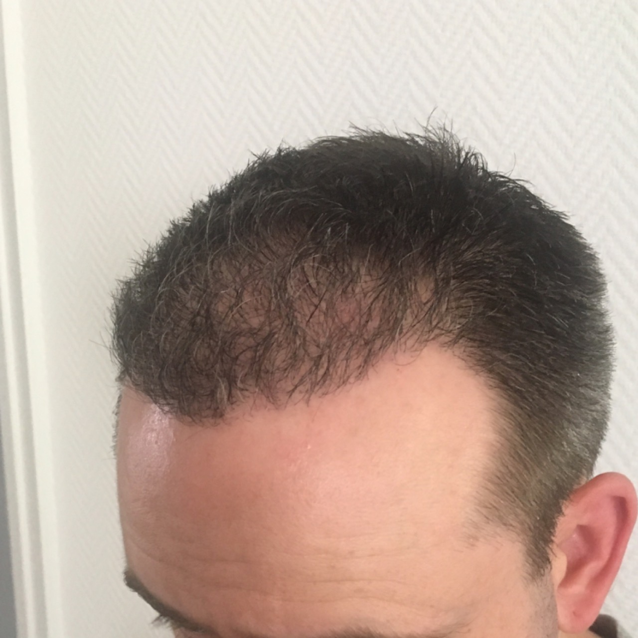 Auf den Bildern kann man ganz gut die vielen hellen und dünnen Haare sehen die in den letzten 1-2 Wochen gesprießt sind, und davon kommen täglich neue hinzu. Zudem merke ich ganz ganz deutlich die Stoppel wenn ich mit der Hand über meinen Kopf gehe.