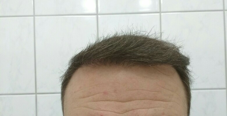 Man sieht an der Haarlinie, dass die Haare falsch eingepflanzt sind und nach oben wachsen.
