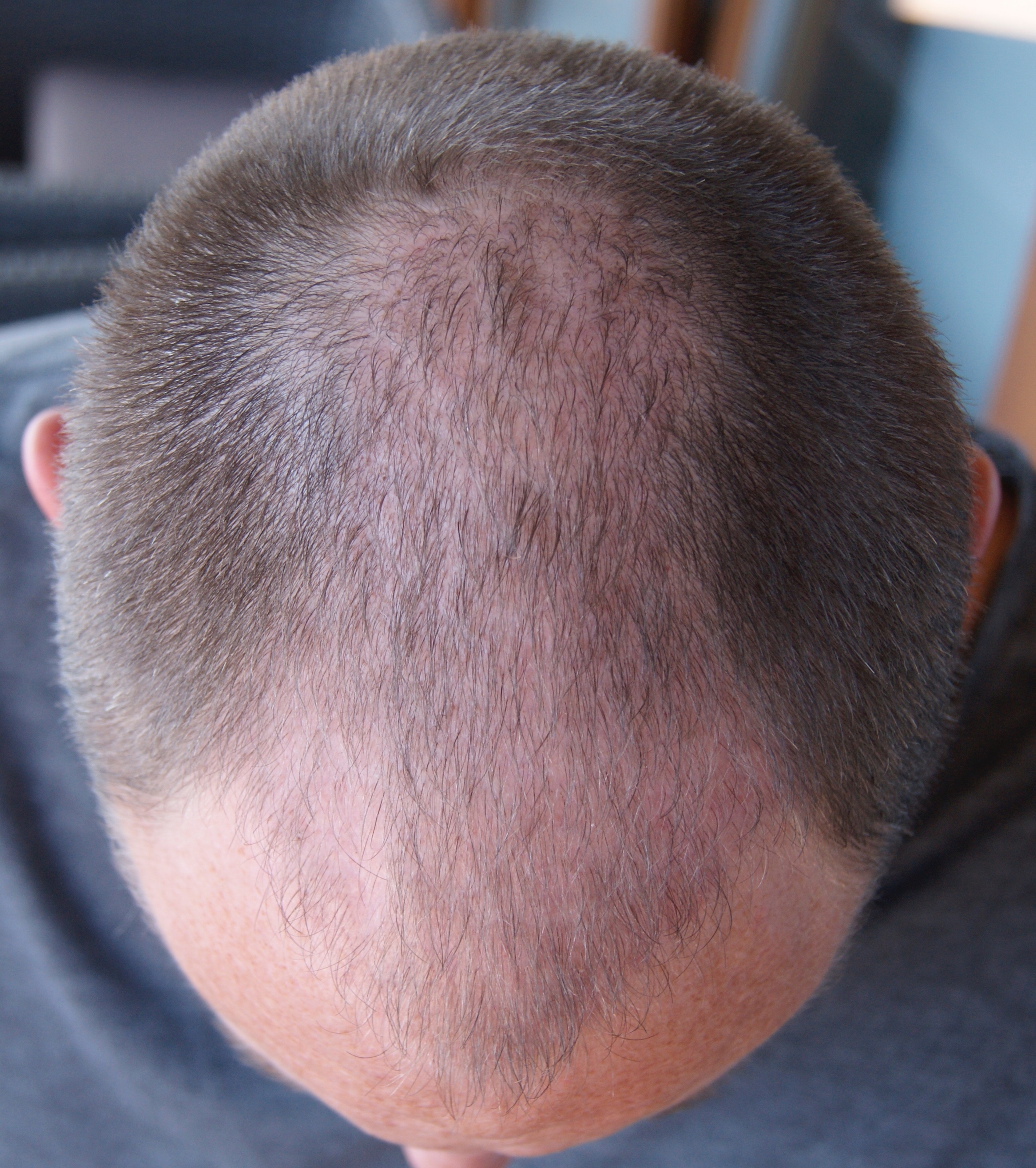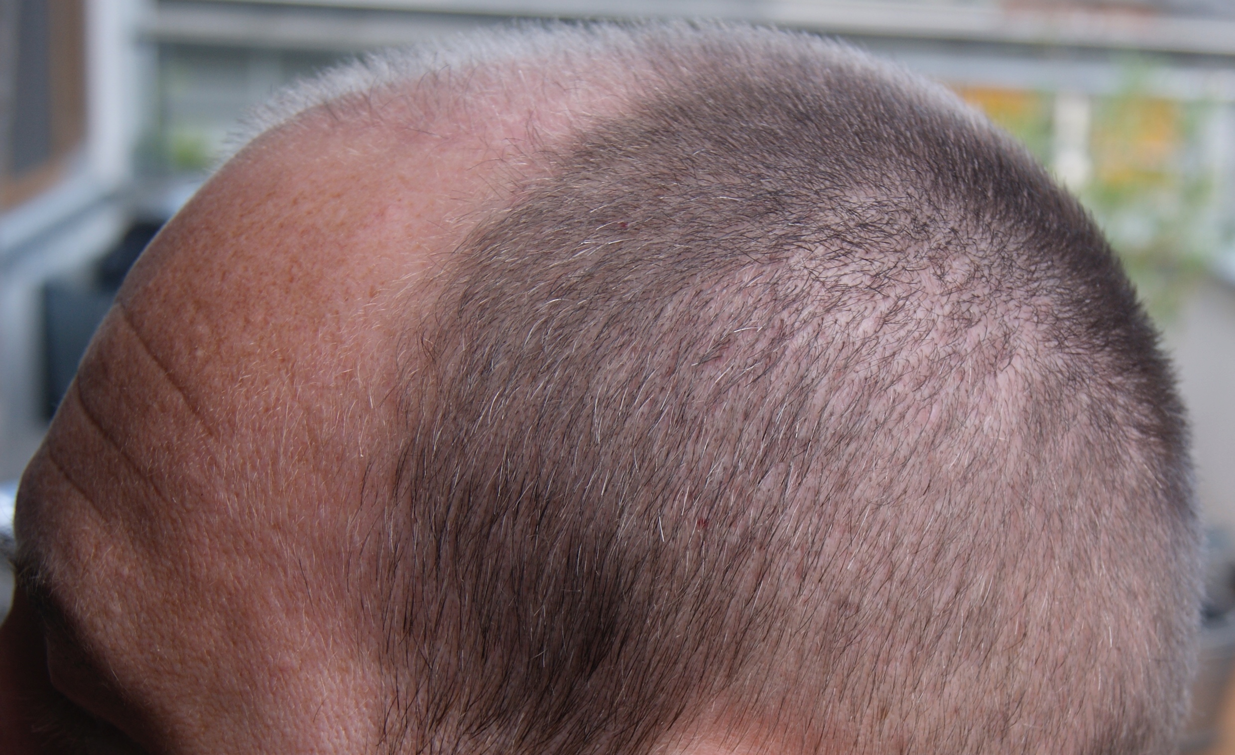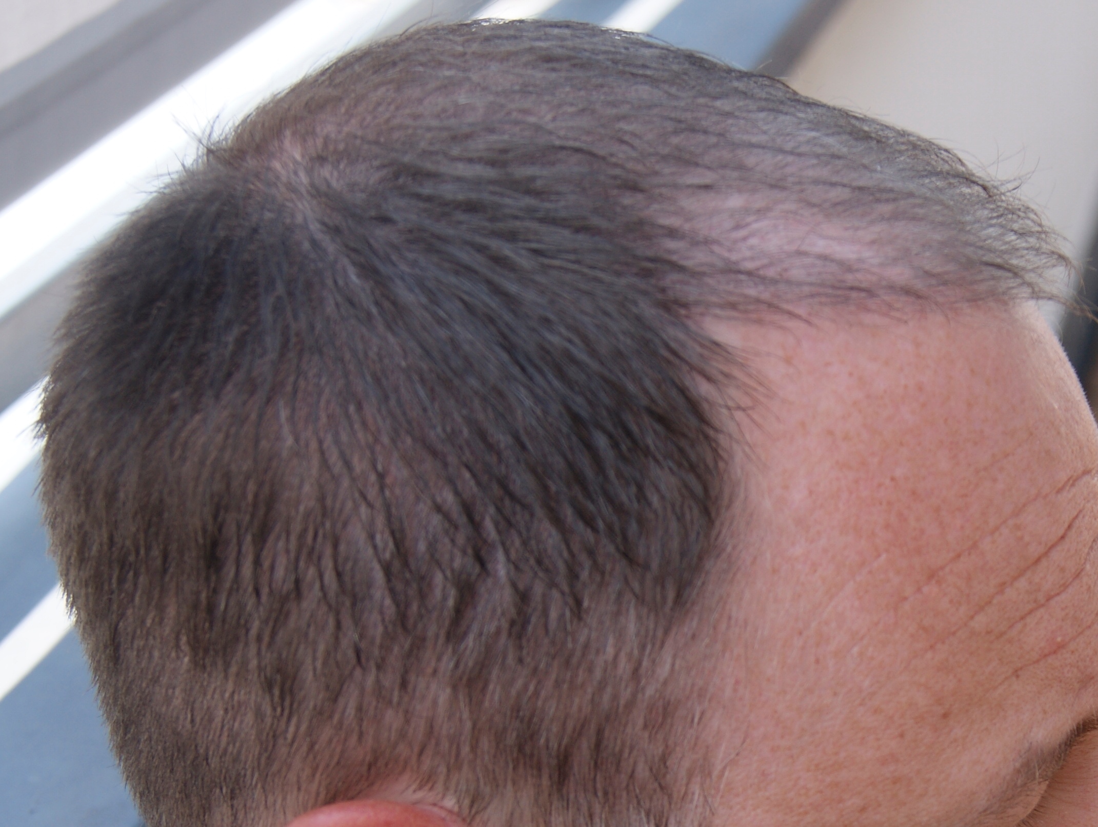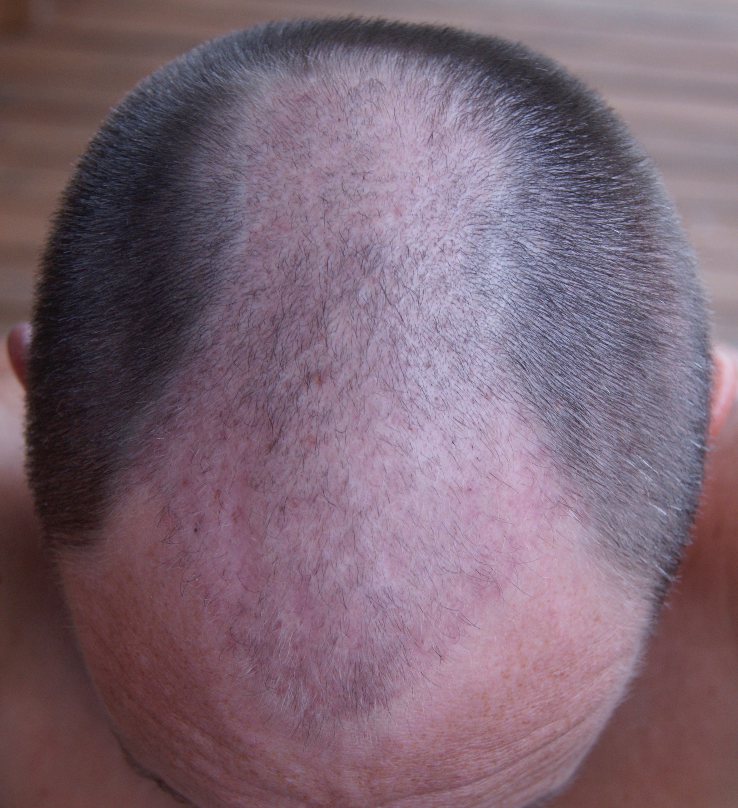 Die Stelle rechts vorne, an der ich Post-OP eine bakterielle Infektion hatte, ist nach wie vor kahl (Fläche ca. 8x20mm); ich habe die Hoffnung aber auch hier noch nicht aufgegeben.