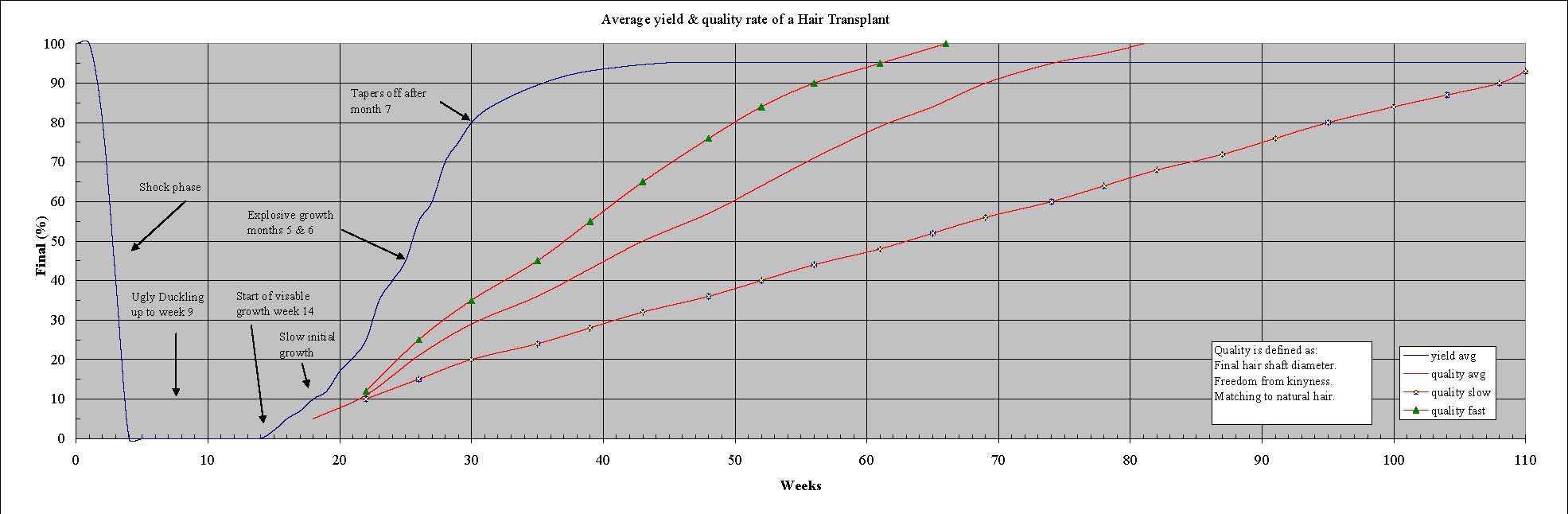 Erfahrungsgemäß findet eigentlich in den meisten Fällen nach dem 6.-7. Monat kein Neuwachstum mehr statt. Das heißt aber nicht, dass das Ergebnis danach nicht noch deutlich besser werden kann. Vor allem eine bessere Struktur und eine gewisse Haarlänge können optische Wunder bewirken.