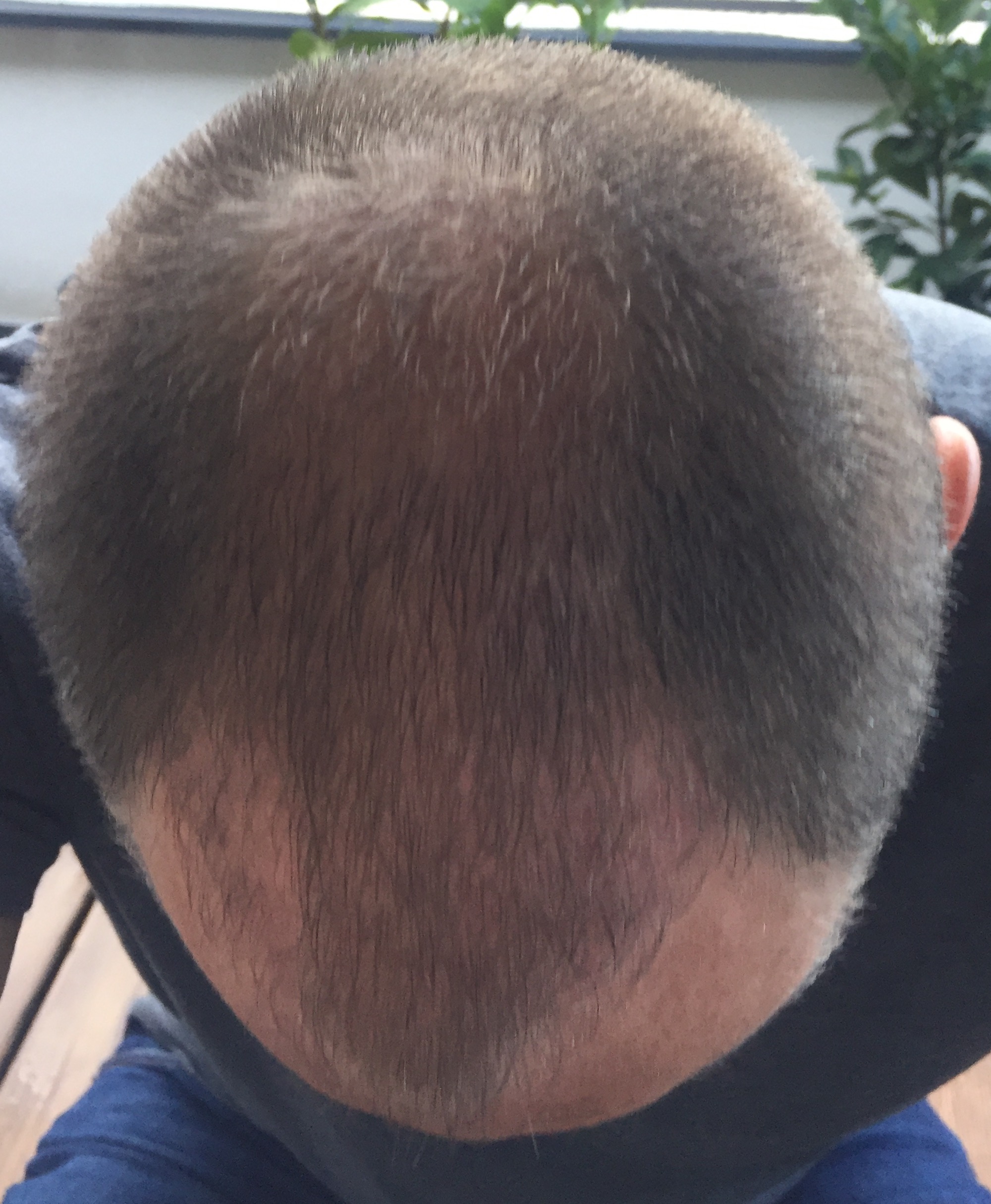 Die Stelle rechts vorne, an der ich Post-OP eine bakterielle Infektion hatte, ist nach wie vor kahl (Fläche ca. 8x20mm); ich habe die Hoffnung aber auch hier noch nicht aufgegeben.
