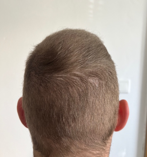 Diesmal wurde reichlich die Tonsur bearbeitet und der vordere Bereich an der Haarlinie noch mal verdichtet. Außerdem wurde noch ein sogenannter Korridor zwischen Haarlinie und Tonsur verdichtet, den man aufgrund meiner Frisur nicht so wahrgenommen hat.
