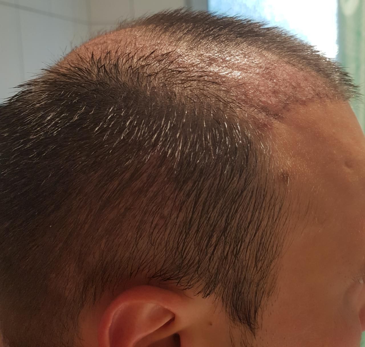 Der komplette Ausfall der transplantierten Haare lässt immer noch auf sich warten. Viele der transplantierten Haare sind auch schon ordentlich gewachsen. Den Entnahmebereich finde ich rein optisch noch recht mitgenommen.