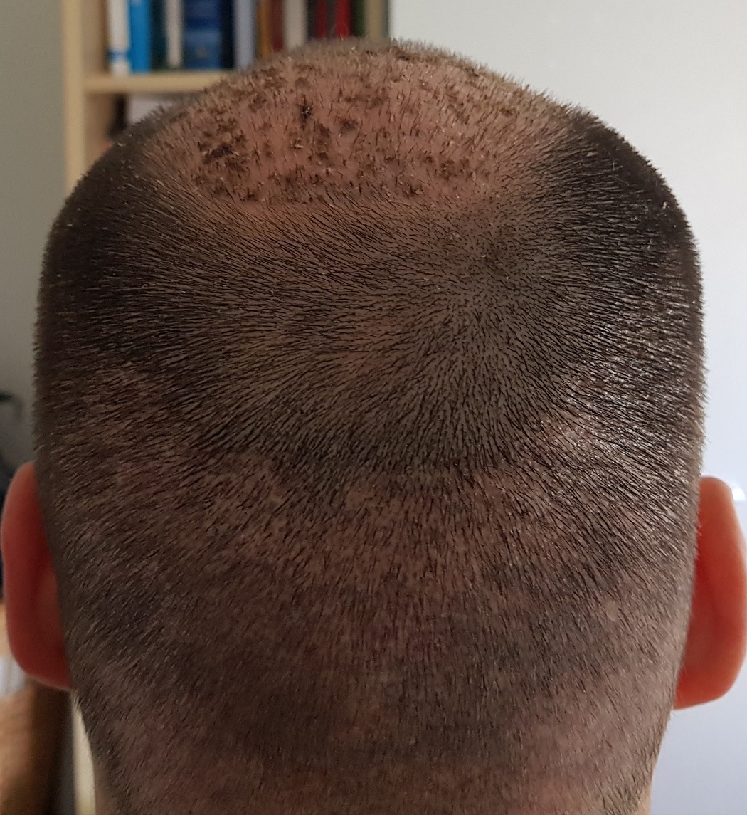 Der komplette Ausfall der transplantierten Haare lässt immer noch auf sich warten. Viele der transplantierten Haare sind auch schon ordentlich gewachsen. Den Entnahmebereich finde ich rein optisch noch recht mitgenommen.