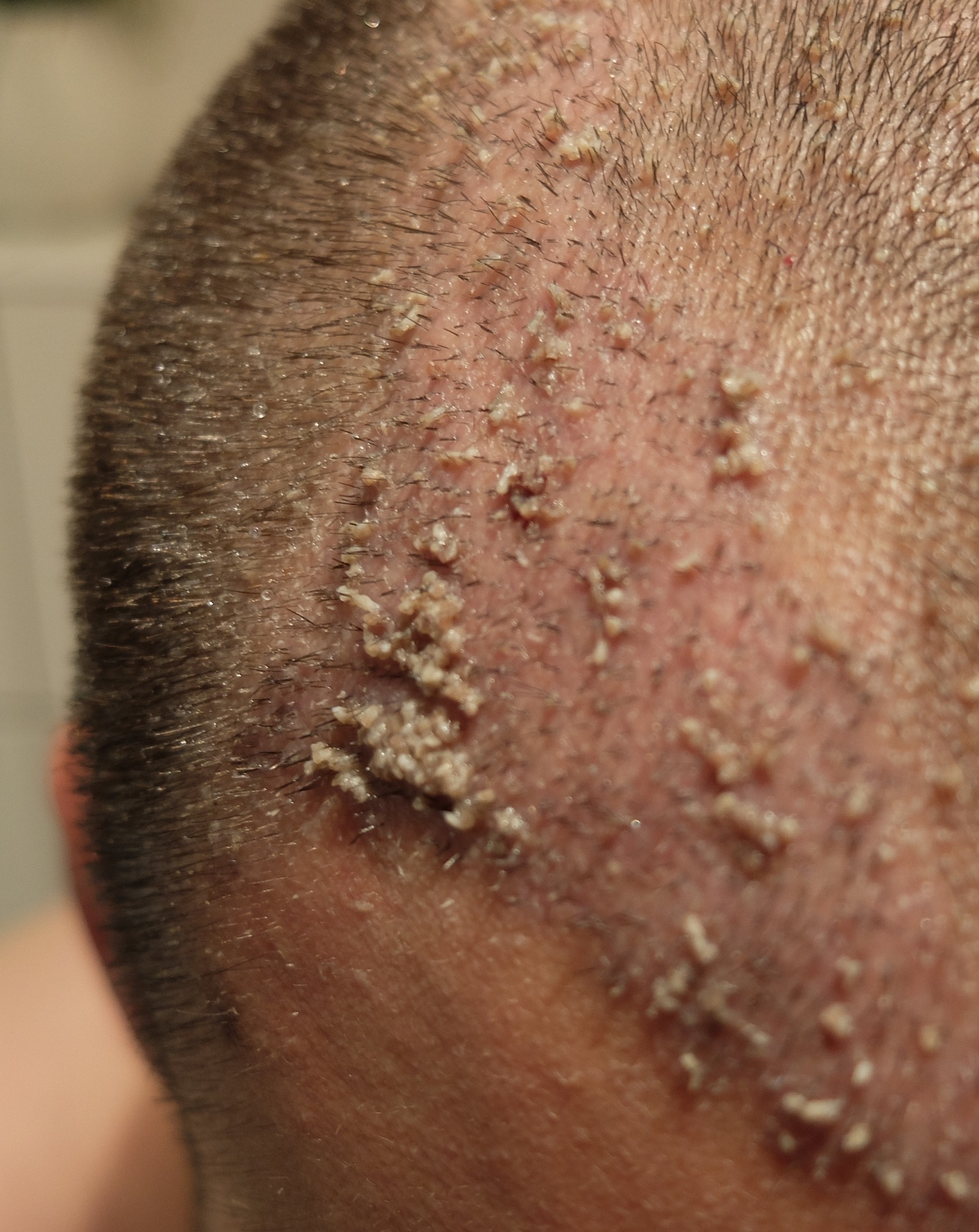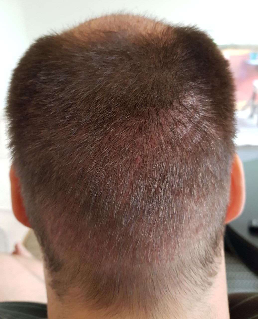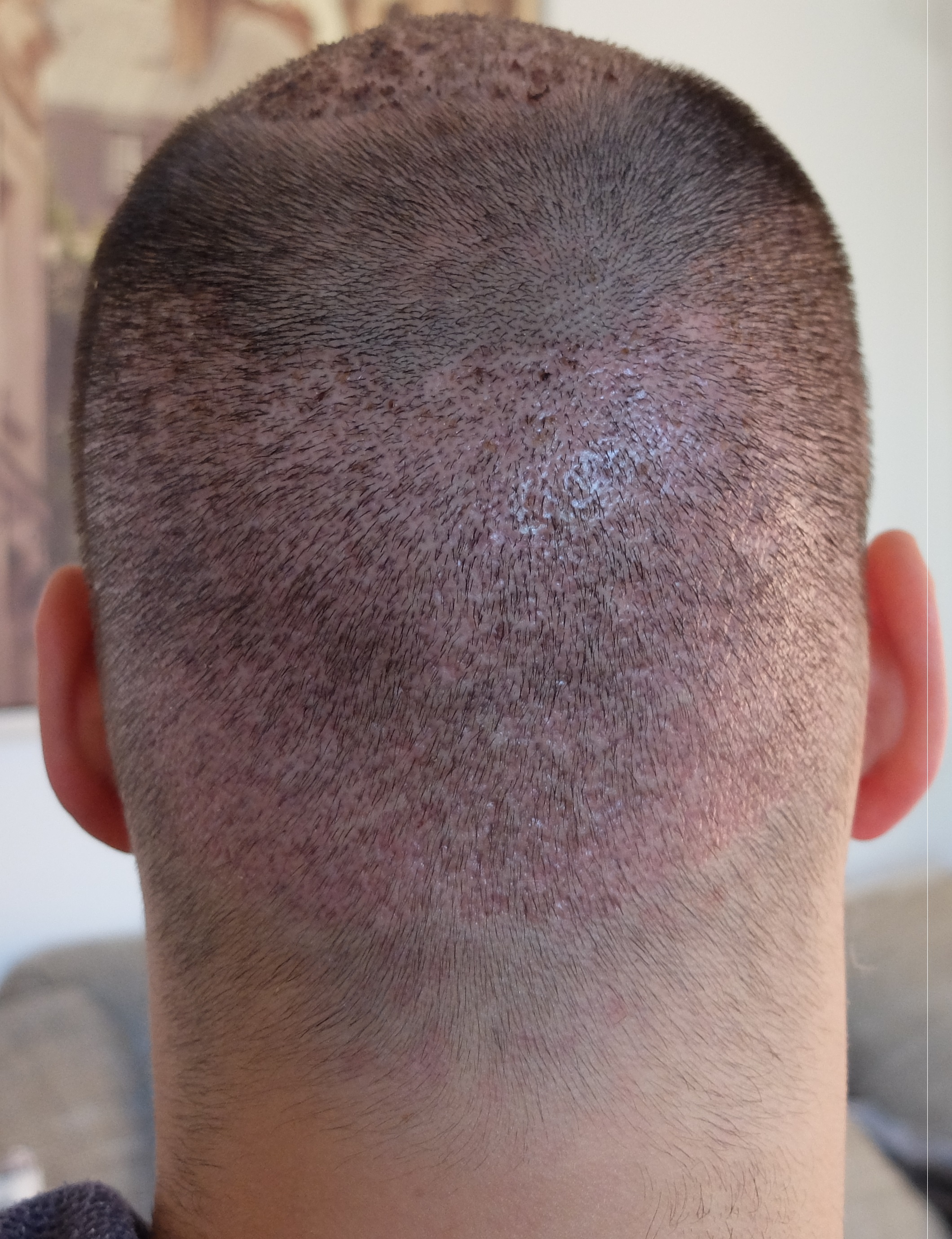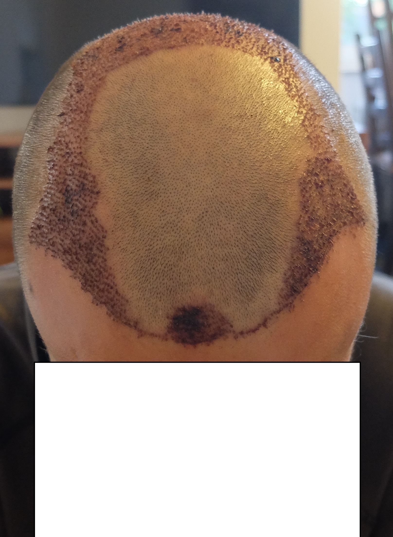 Der komplette Ausfall der transplantierten Haare lässt immer noch auf sich warten. Viele der transplantierten Haare sind auch schon ordentlich gewachsen. Den Entnahmebereich finde ich rein optisch noch recht mitgenommen.