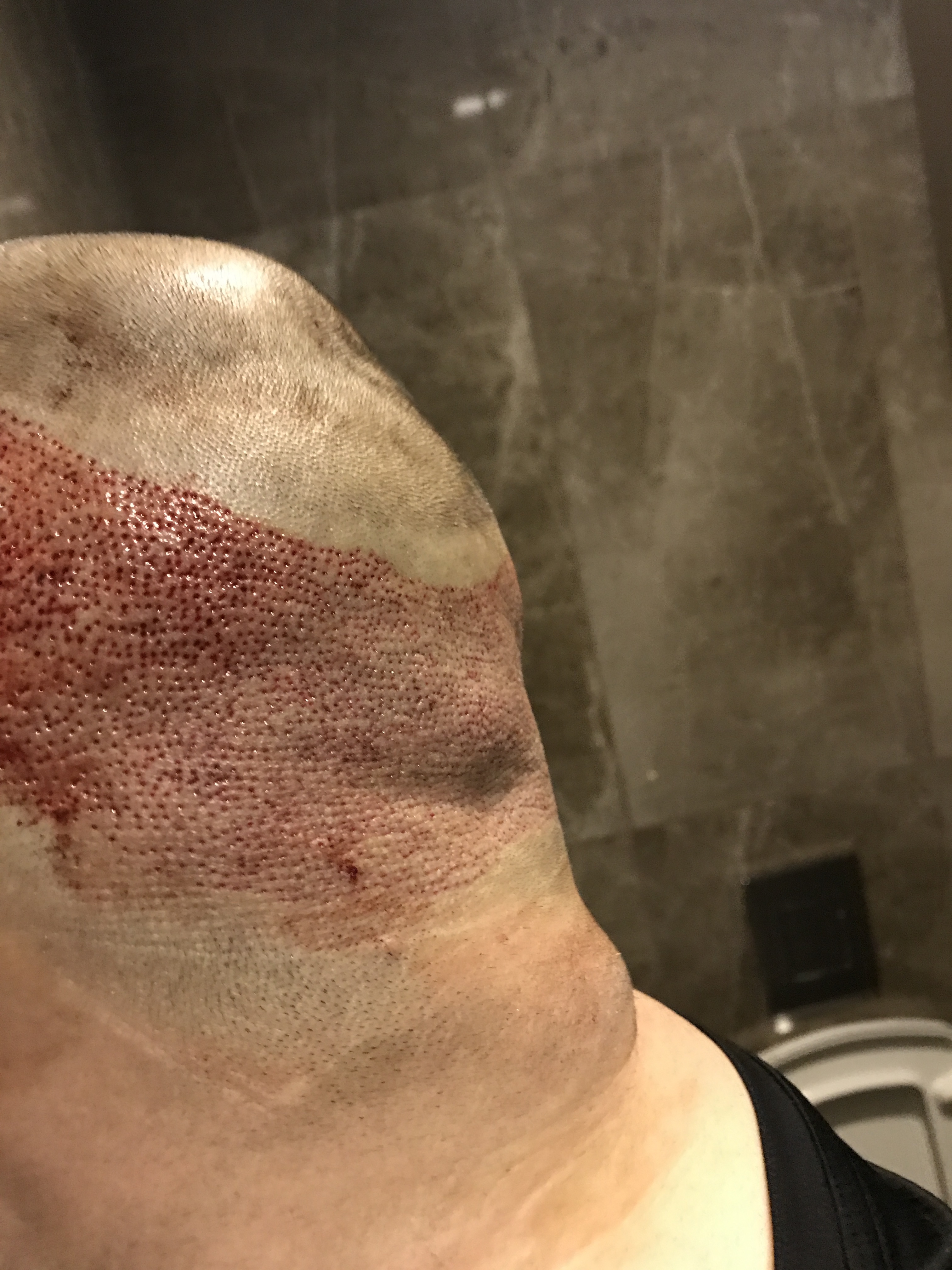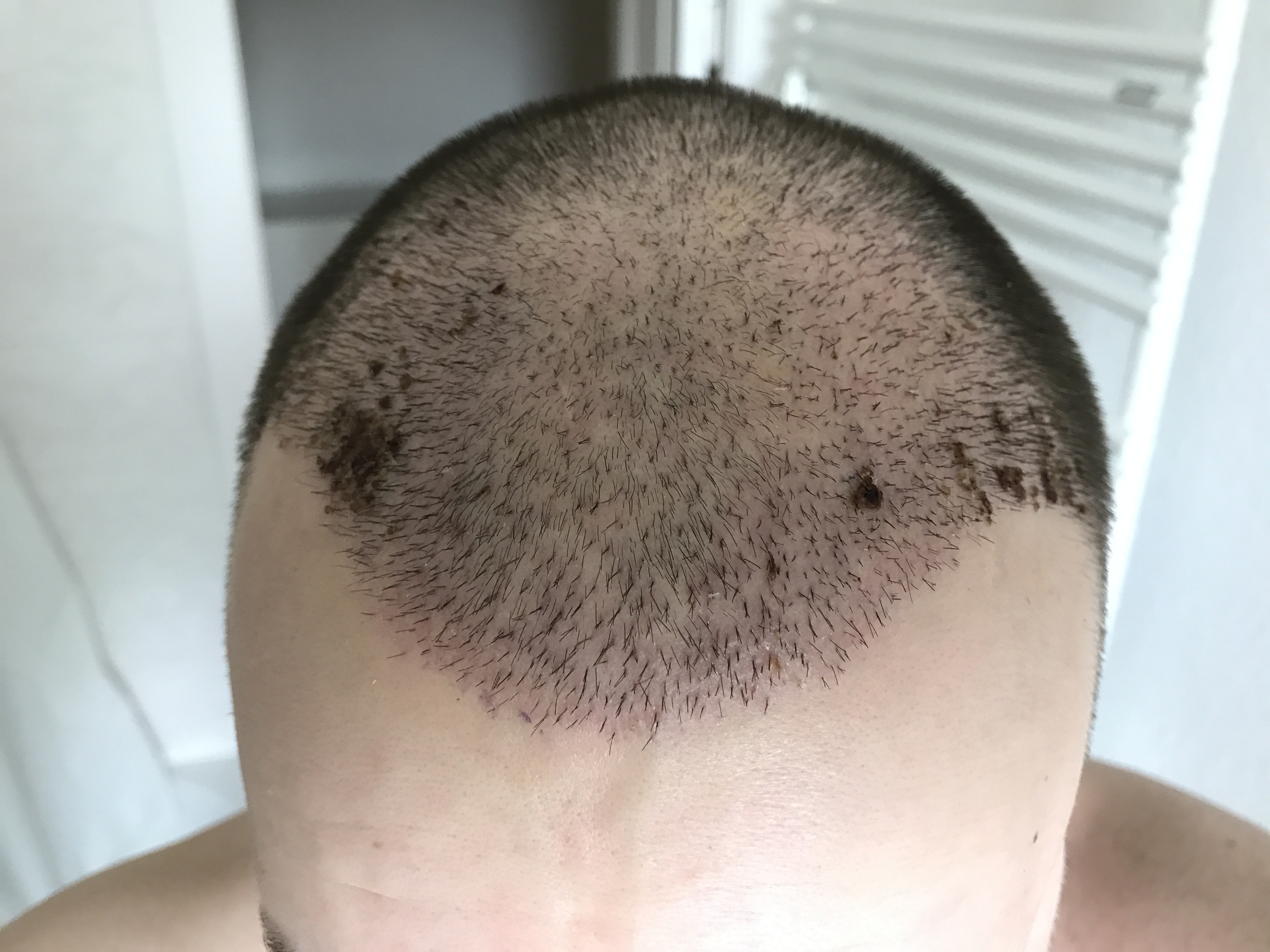 Finde der Donor sieht schon mitgenommen aus. Ich hatte meine HT zur gleichen Zeit (14.6) und kann daher das bisherige Resultat gut vergleichen. Bei mir sieht man so gut wie nichts von der Entnahme, trage die Haare ca. 4.5-7 mm. Hoffe es verbessert sich noch.