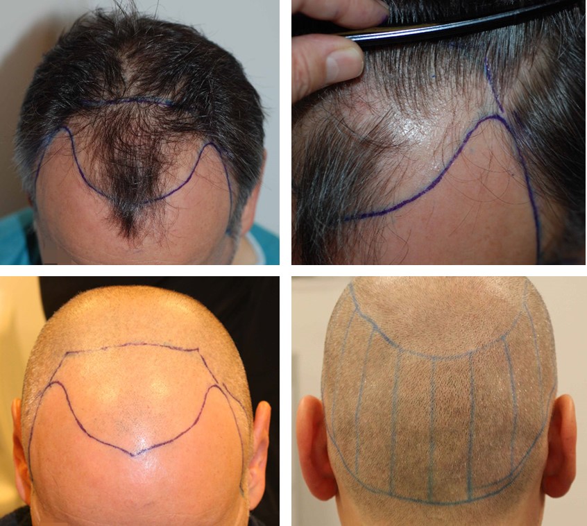In Vorbereitung zur OP wird mir von Dr. Feriduni die Ziel-Haarlinie mit einem speziellen Stift auf die Kopfhaut aufgemalt und nochmals mit mir besprochen, es werden Fotos vor der obligatorischen OP-Rasur gemacht. Man kann gut durch die Haare die obere blaue Linie in Kopfmitte sehen, ab dort beginnt unbenommen der restlichen Haare der Empfängerbereich.