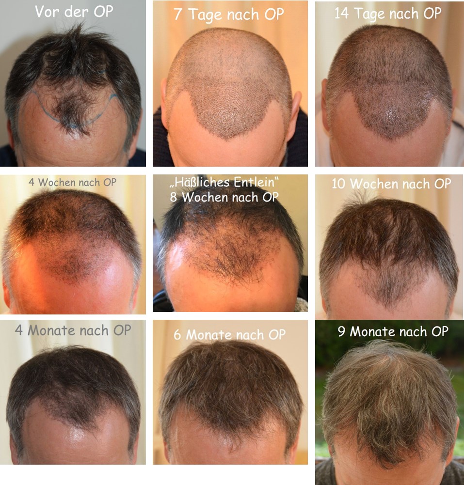 Ab dem dritten Monat geht es dann schnell voran, wenn die neu implentierten Haare wieder mit normaler Geschwindigkeit nachwachsen. Die Bilder im Zeitablauf sind aufgrund der technischen Beschränkungen dieser Plattform in der ersten (eigener) Antwort auf diesen Beitrag in der Anlage.