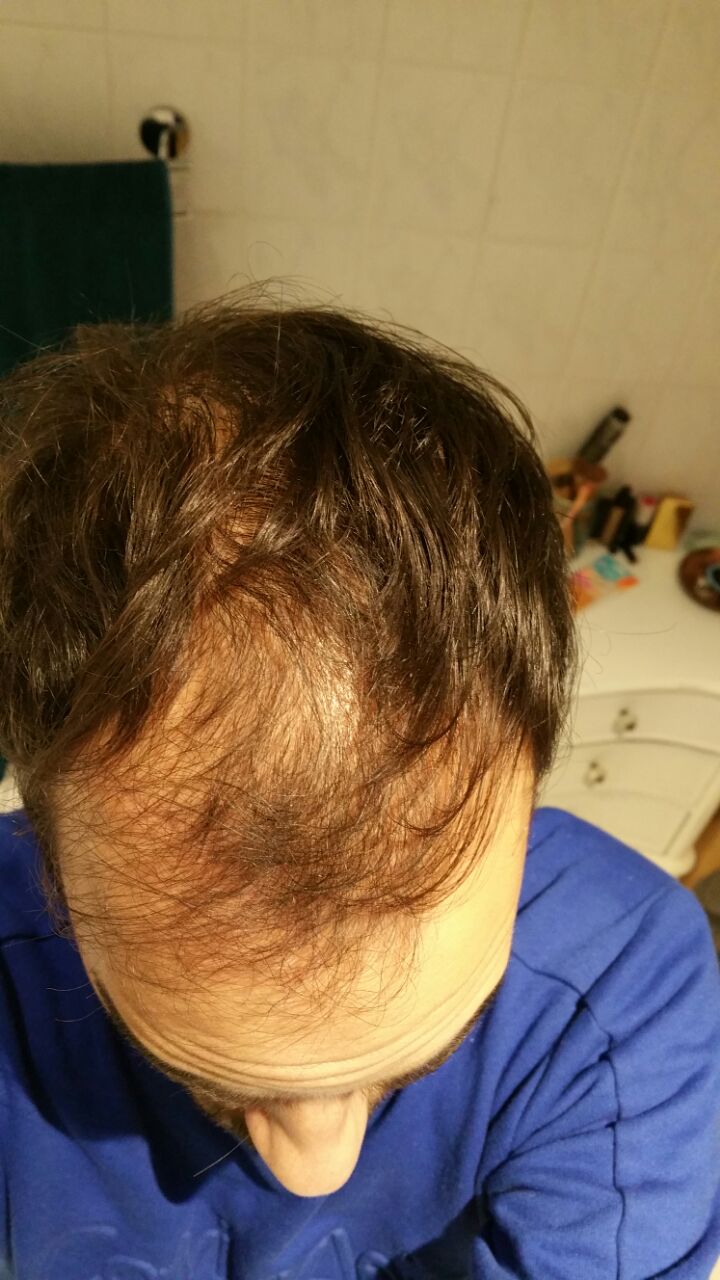 ich bin 24 und habe seit ca 5 Jahren Haarausfall. Vorne ist so gut wie nichts mehr und schreitet nun typischerweise Richtung Hinterkopf langsam voran. Die Tonsur ist (noch) dicht, ich denke aber, dass es (laut Familienstammbaum) mit ca 30 schon fast eine Vollglatze sein wird.