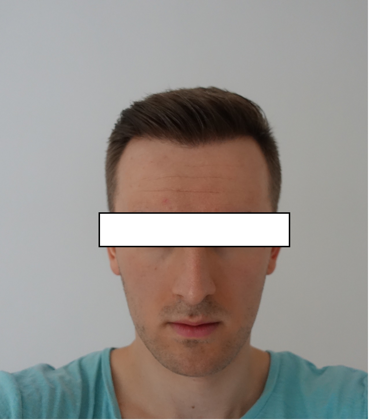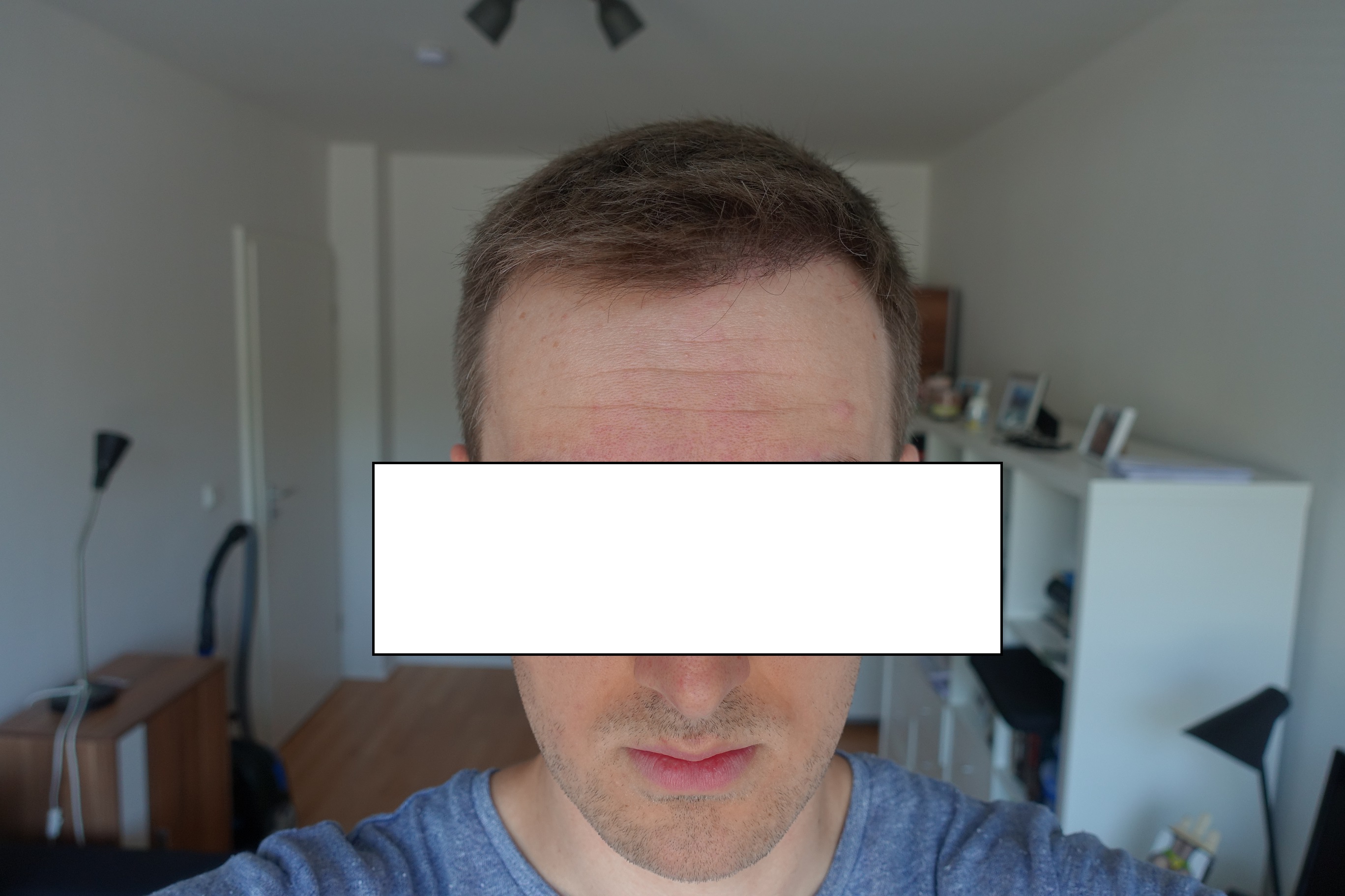 Könntest du auch mal ein Foto aus der Augenhöhe machen, damit man die Haarlinie mal von vorne betrachten kann, anstatt von leicht oben?