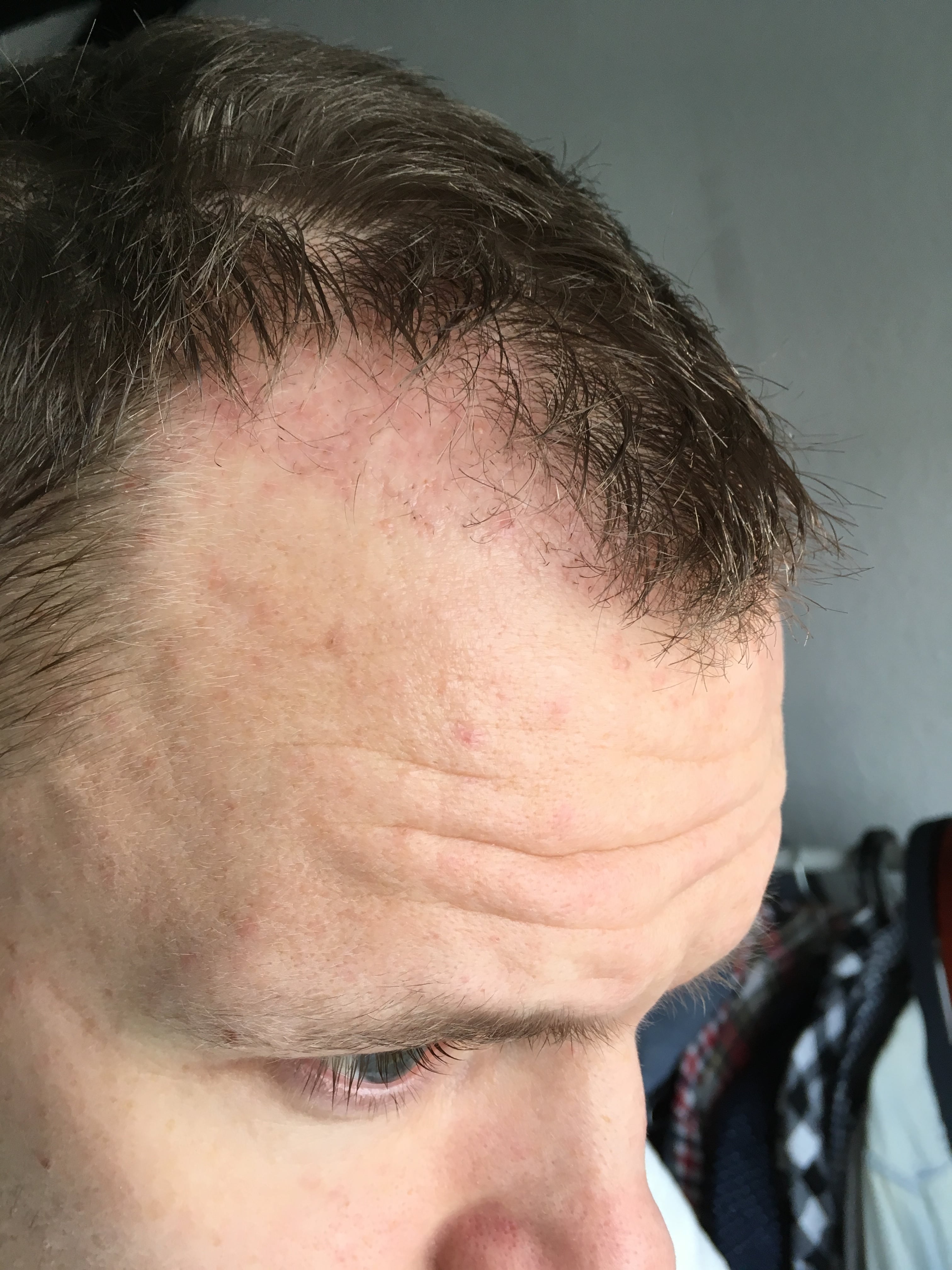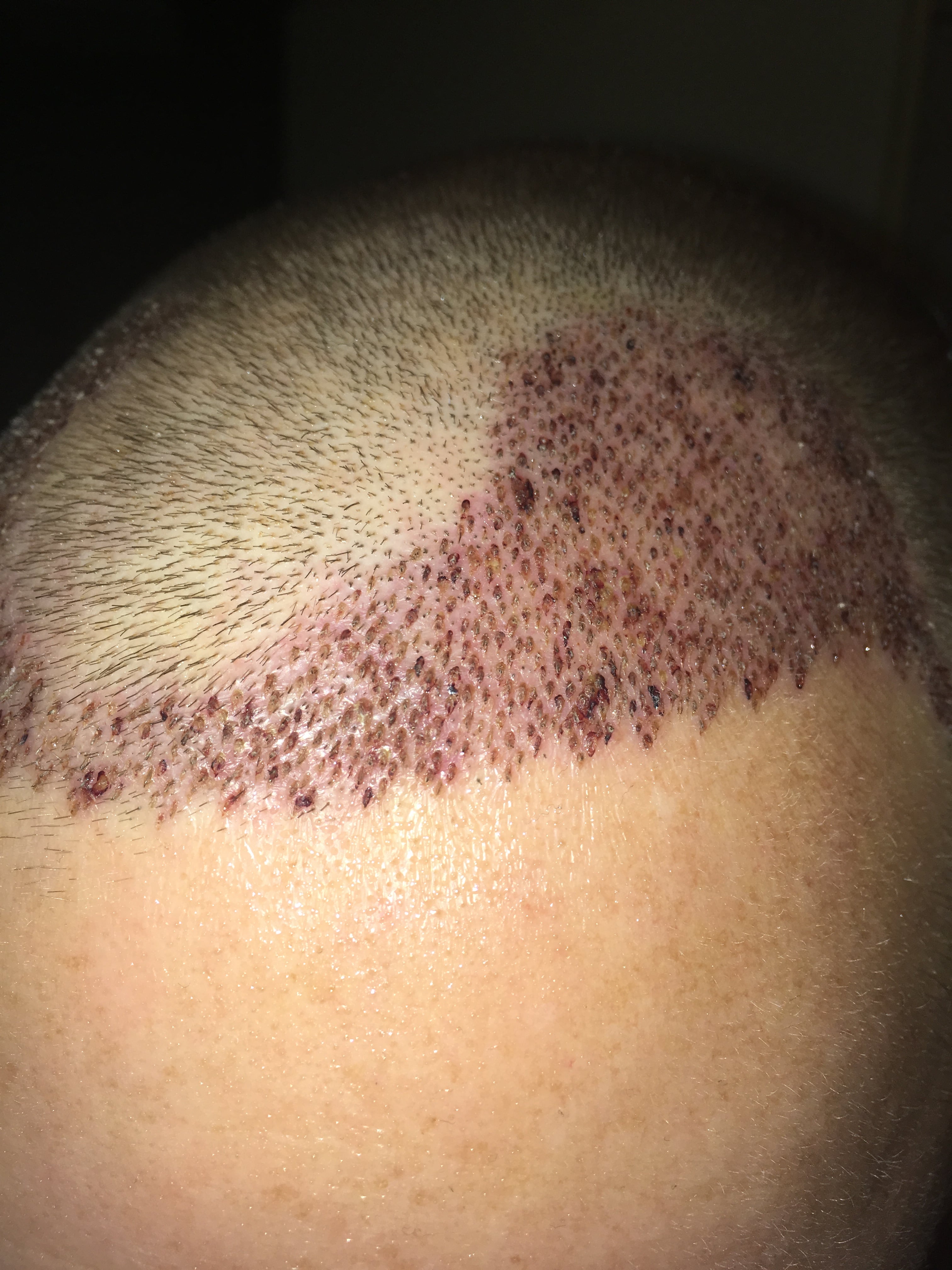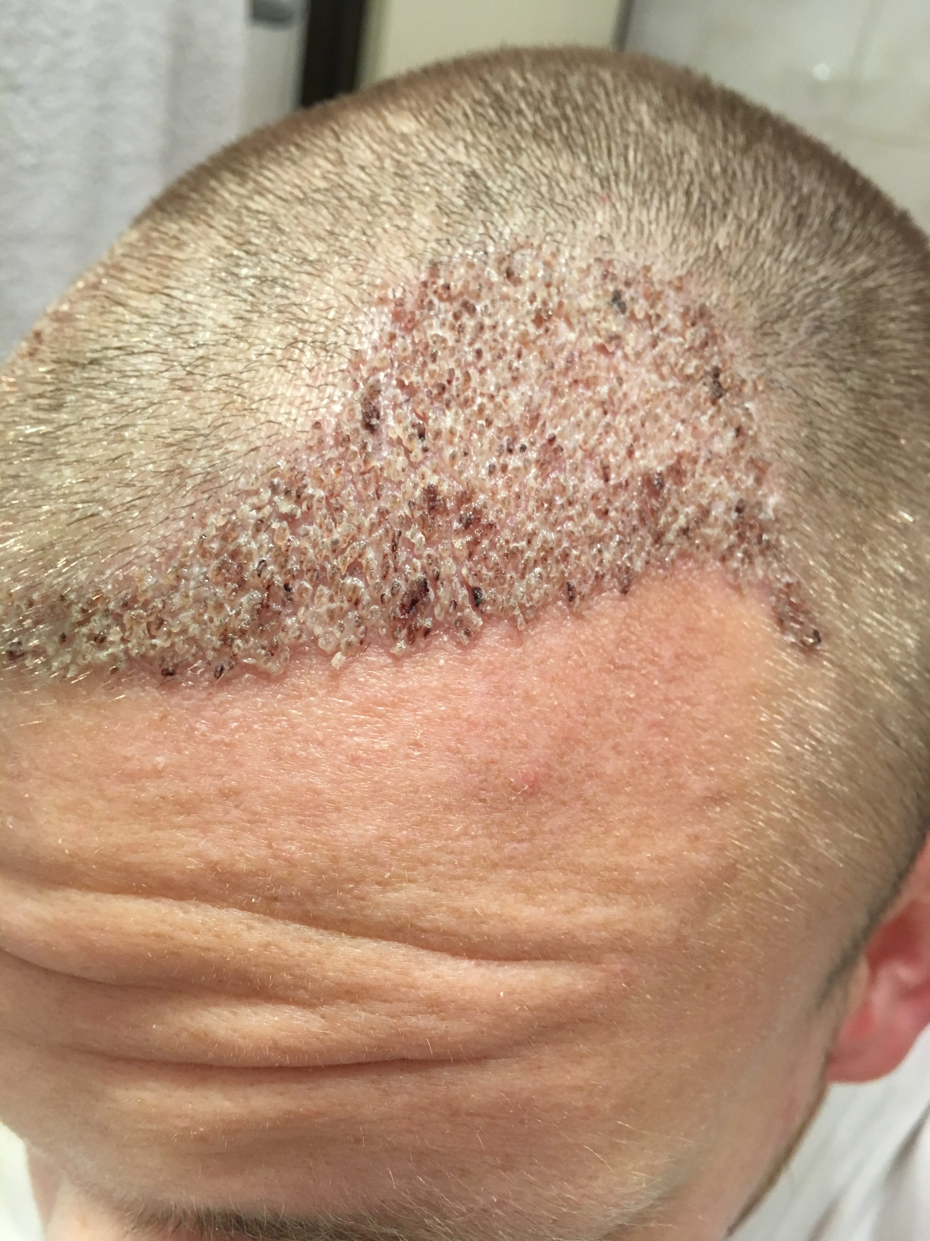 Seit Tag 4/5 post OP macht mir eine kleine Stelle auf der rechten Seite ein bisschen Sorge. Auf Anweisung von Dr. Demirsoy respektive Hr. Weber behandle ich die täglich mit Jod als Antiseptikum. Dr. Demirsoy meint, dass es nichts schlimmeres ist. Ich hegte schon die Befürchtung, dass es eine bakterielle Infektion sein könnte, ähnlich wie sei bei _Mario auftrat. Mit dem Auge im Spiegel sehr schwer zu erkennen, auf Fotos mit Blitz hätte man an einer Stelle Eiter interpretieren können. Auch die Dunkelrotfärbung der Stelle machte mich stutzig. Auch hier mache ich mir vermutlich wieder viel zu viel Sorgen. (Mann, langsam habe ich mehr Bilder von meiner Haartransplantation als von meiner Verlobten auf dem Handy Laughing )
