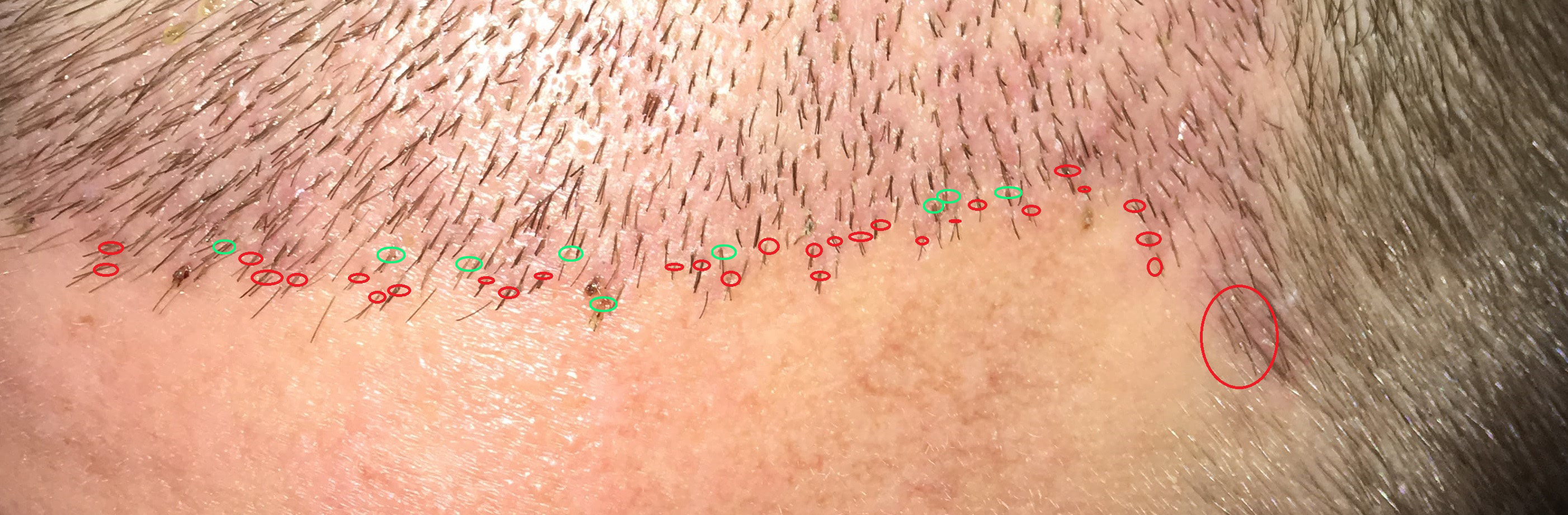 Ich bin gerade durch Zufall über Deine Post-Op Bilder gestolpert und da gerade in einem anderen Teil des Forums eine interessante Diskussion über Haarlinien Design läuft (https://www.alopezie.de/foren/transplant/index.php?t=msg&goto=132954/#msg_132954) bzw. (https://www.alopezie.de/foren/transplant/index.php?t=msg&goto=132956/#msg_132956) habe ich für mein Feedback mal etwas genauer hingeschaut. Hat der Doc etwas zu Deinen Grafteigenschaften gesagt? Der Grund meiner Frage ist der wirklich außergewöhnlich hohe Anteil an Multis in der ersten Reihe. Dank Deiner hochauflösenden Photos konnte ich eben mal exemplarisch die Zweier und Dreier Grafts markieren und war doch relativ erstaunt...
